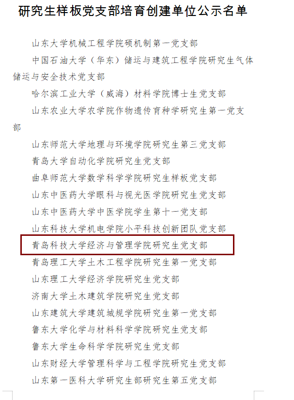近日,根据《中共山东省委教育工委关于开展全省高校“研究生样板党支部”和“研究生党员标兵”创建工作的通知》(鲁教工委函〔2021〕1号)安排和评审工作方案,经组织推荐、专家评审、集体研究,共遴选产生了20个首批全省“研究生样板党支部”培育创建单位,北京赛车PK10