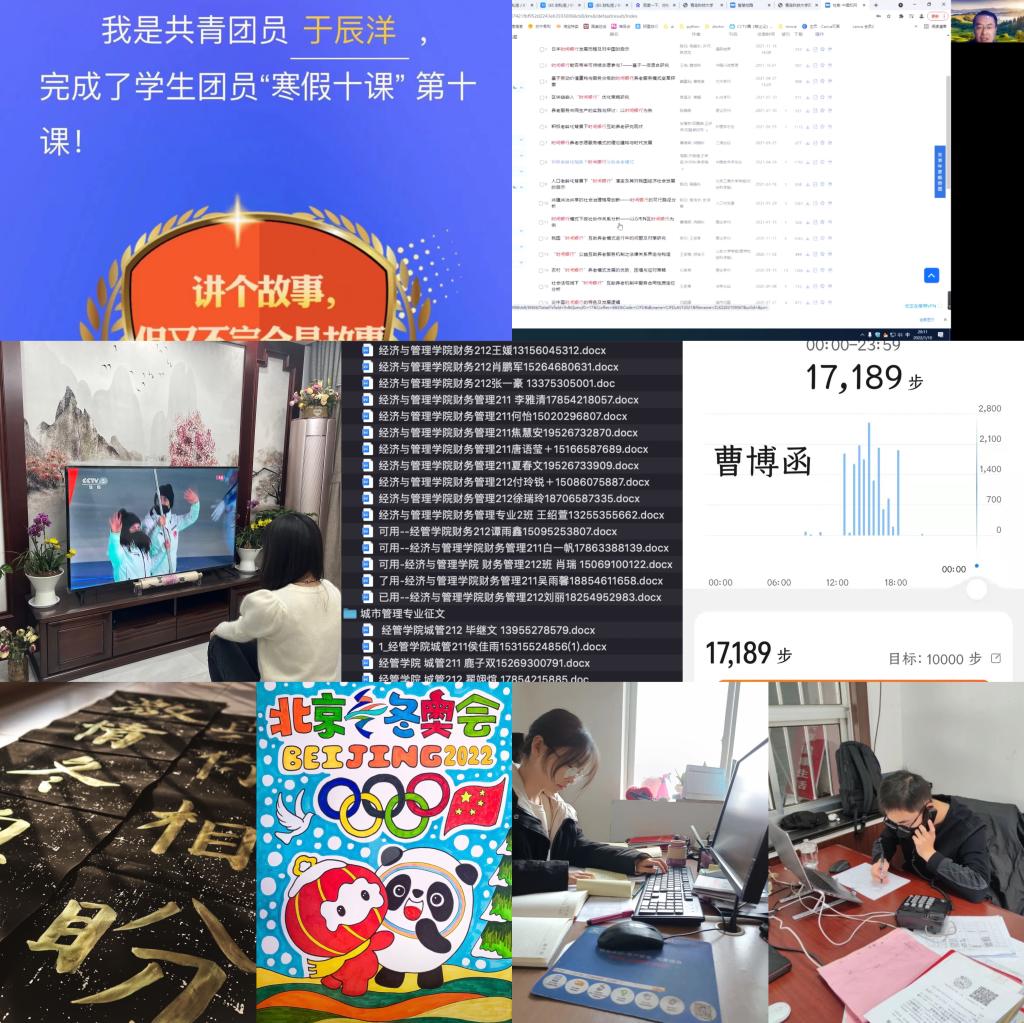 ;开展“我的读书日记”读书活动,并分阶段引导学生做好读书笔记、撰写读书报告;组织学生积极开展“寒假十课”学习并跟踪进度,以主题团课的形式组织全体学生学习共青团十八届六中全会精神,组织全体学生观看冬奥会开幕式,并积极参与“迎冬奥,我来赛”网络知识竞赛,全面提升学生理论水平。强化智育巩固学习,期末成绩公布后第一时间统计各专业挂科情况,成立专业内部学习互助组开展课程补习,利用假期时间及时查漏补缺;围绕科创竞赛全面铺开,组织全体学生积极参与科创赛事,并就学生组队、选题、指导、ppt制作、参赛经验分享及心理辅导等开展“一条龙”服务,助力学生培育科创思维。强化体育夯基固本,积极响应北京赛车PK10
