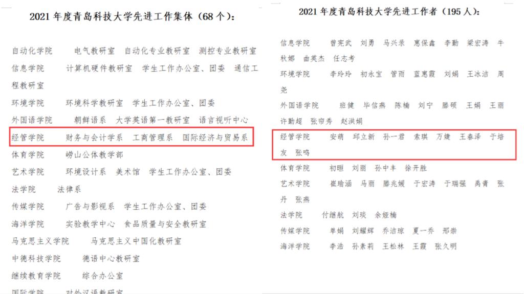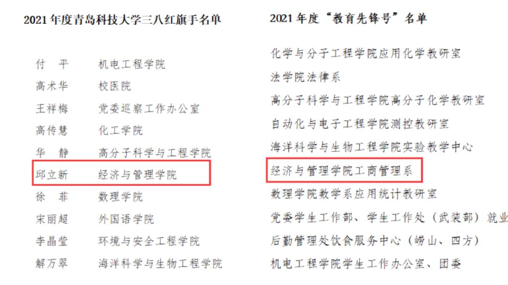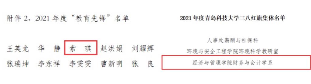 3个集体及8名教师在上述各类评比中均摘得荣誉,其中财务与会计学系、工商管理系、国际经济与贸易系获评校“先进工作集体”,安萌、邱立新、孙一君、索琪、万婕、王春泽、于培友、张鸣老师获评校“先进工作者”,邱立新老师获校“三八红旗手”称号,财务与会计学系获评“三八红旗集体”,索琪老师获评“教育先锋”,工商管理系获评校“教育先锋号”称号。