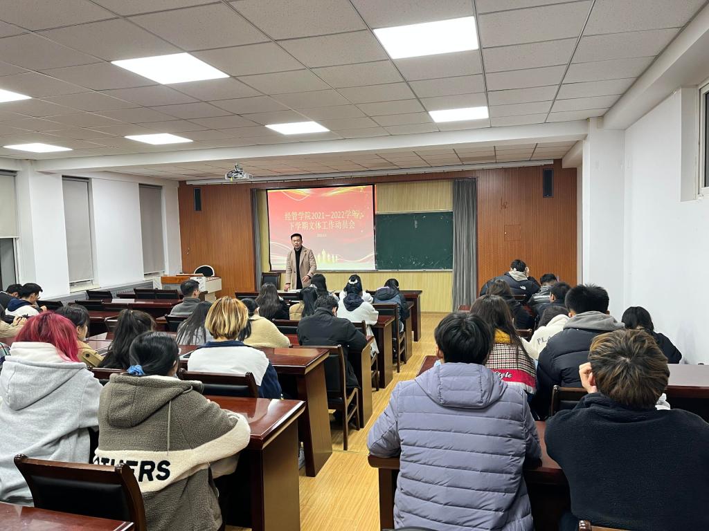 2021—2022学年下学期文体工作动员会在经管楼419会议室召开。会议由体育部负责人丁思雪主持,文体活动指导老师高守朋老师出席会议并作工作动员。