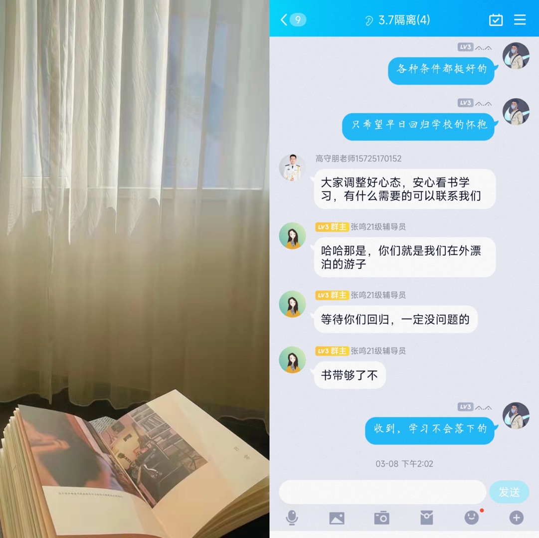 也暖心地为我们整修了住宿环境,提供各种生活所需。后来,老师每2小时的一次电话和零食物品,同学朋友每时每刻的关心问候,让我不安的心情甚感温暖。