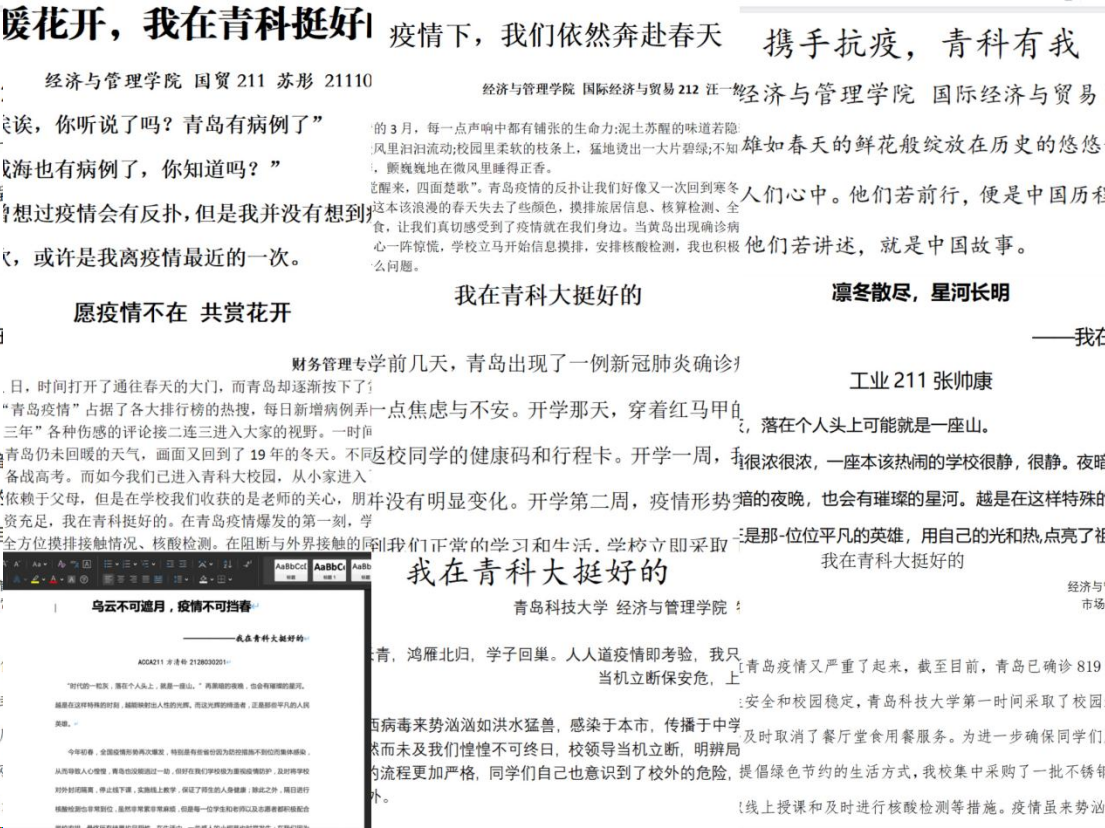 关于疫情防控工作的具体要求,全方位上好疫情防控“大思政课”。面向全体学生征集“我在青科大挺好的”主题征文,鼓励同学们用温暖的文字表达对战“疫”必胜的信心、关于疫情的深度思考以及同学们通过此次疫情大考获得的成长与进步,引导同学们积极关注自我,增强心理免疫力,进一步提高同学们的心理防疫能力和自我调适能力。广泛开展“用‘心’战‘疫’”线上主题班会,加强权威信息推介和宣传引导,减少焦虑恐慌情绪,引导学生及时调整负面情绪,相互关爱支持,凝心聚力打赢疫情防卫战。