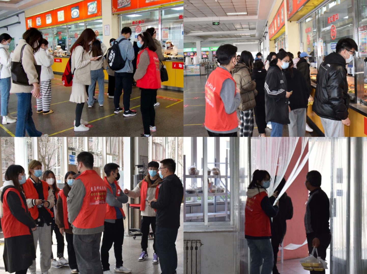 南苑食堂门口及窗口进行监督提醒,督促同学们佩戴口罩,协助食堂工作人员测量体温、引导取餐人员在排队取餐时保持一米间隔,为大家宣传防疫知识,维持秩序。周二的食堂里,取餐队伍秩序井然,与志愿者们组成的防线交相辉映,此刻的责任与温暖并行,温暖着每一颗心。来来往往的师生对这群“突击队员”的热情细致频频竖起大拇指,“为他们点赞!食堂秩序更好了,买饭反而更快了”,身为志愿者的21级财务管理专业刘雪祯同学说,“我们的提醒被记住了”,一丝暖意让一天的倦意全消。