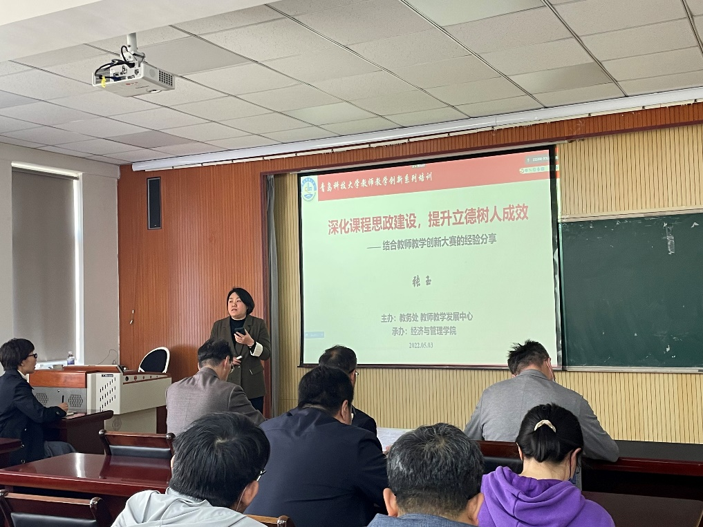 会上,张玉以自己讲授的《税收学》课程为例,结合自己的教学实践,从教学创新大赛与课程思政、课程思政实施过程、课程思政实施效果等四个方面进行了经验分享,从教学创新大赛评分表入手,详细分析课堂教学实录视频、教学创新成果报告和教学设计创新汇报中课程思政的重要性,建议教师们要根据自己的课程特点,围绕教学目标,深入挖掘思政元素,有机融合思政元素与教学内容,润物细无声地培养学生善于观察思考、敢于实践,勇于探索的精神。