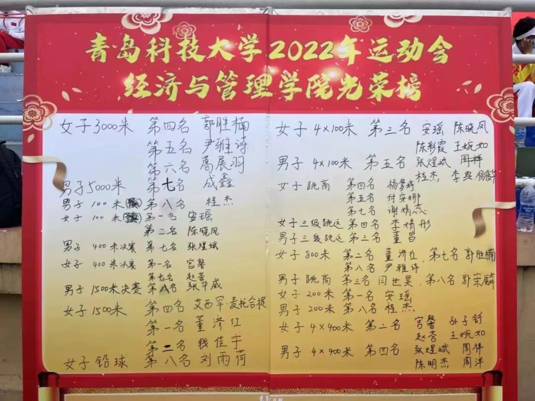 赛场上,经管学子充分展现了勇立潮头、敢为人先的精神风貌和顽强拼搏、超越极限的体育精神,以超强的团队凝聚力与战斗力,荣获多个奖项:学生女子组团体总分第二名(崂山校区第一名)、学生男子组团体总分第六名、排舞比赛二等奖与精神文明奖等四项荣誉,其中,北京赛车PK10