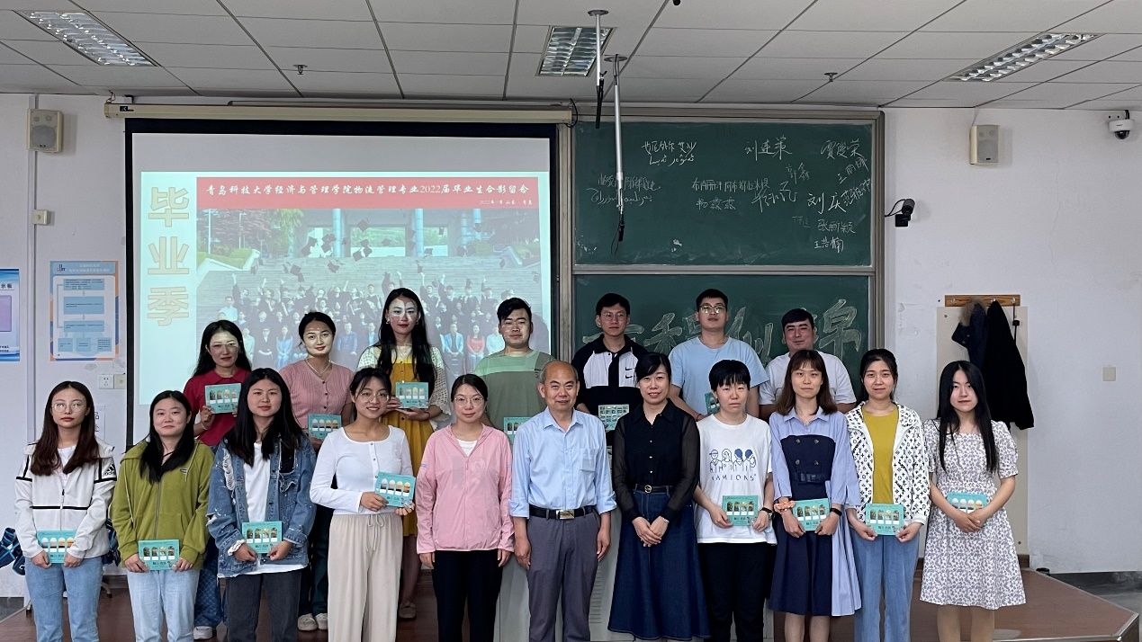 最后,师生共同拍摄了专业全家福,老师为同学们准备了毕业纪念礼物——青岛明信片,欢迎同学们常回家看看,青科大物流是同学们永远的家。伴随着座谈会的结束,物流管理系2022届毕业生的大学生涯即将结束,但崭新的人生舞台才刚刚开启,期待这些少年能够在未来乘风破浪,披荆斩棘,拥抱精彩人生。
