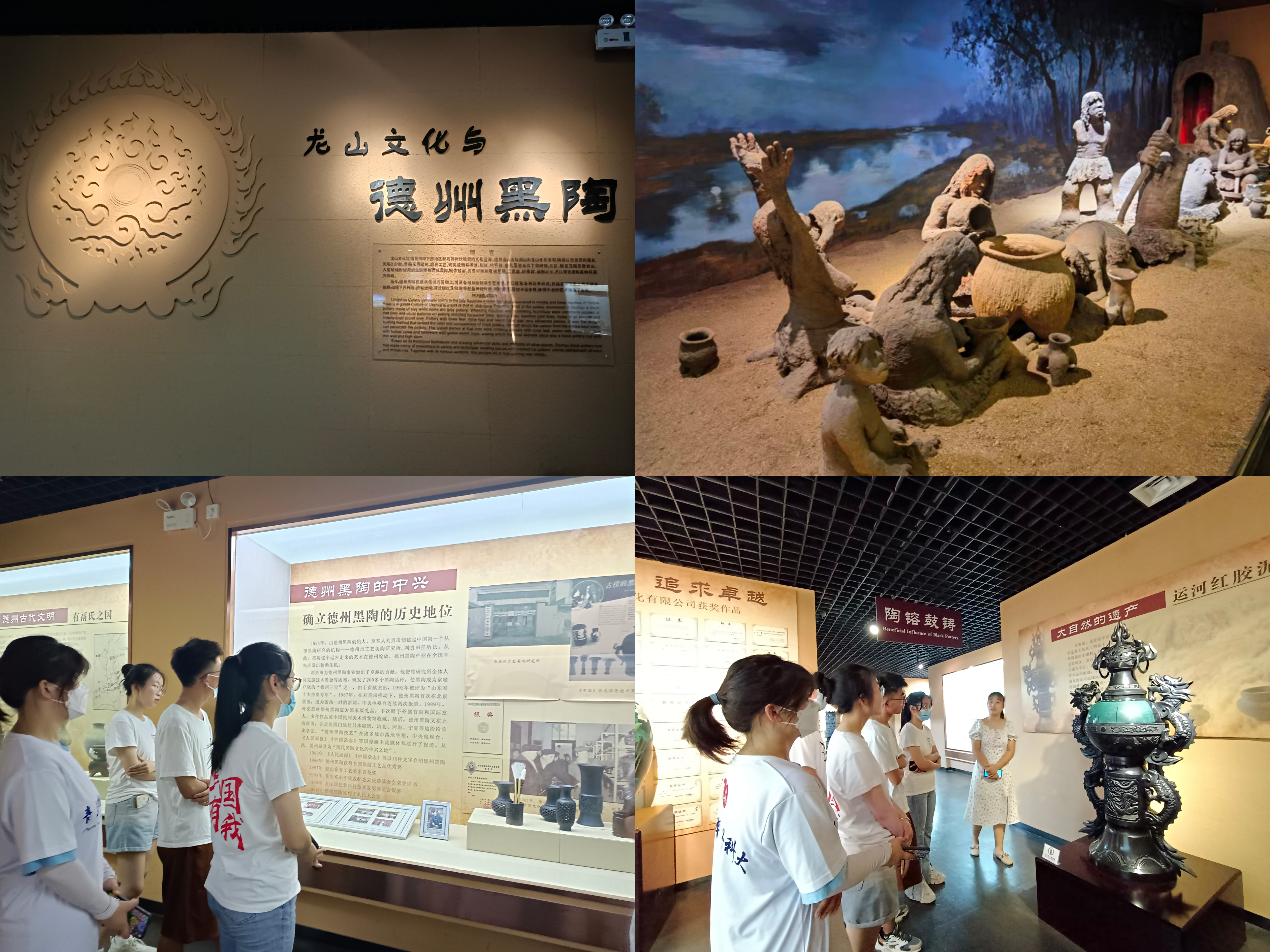 参观了整个黑陶博物馆的,实践队员领略了黑陶的前世今生,黑陶文化以大汶口文化为最早,距今已有月6000年历史,因以黑色陶器为主要特征,又称为“黑陶文化”,博物馆的蛋壳陶曾参加《国宝会说话》节目。黑陶匠人们也在不断创新新工艺,参观中有幸了解了三种新工艺,第一个是金丝漆陶工艺,借鉴北京景泰蓝掐丝点燃工艺;第二个是硬刻陶工艺;第三个是漆画工艺,美轮美奂的工艺品深深地打动了实践队员。在进一步了解黑陶文化、观看黑陶作品、参观黑陶技艺后,实践队员们深入了解德州黑陶文化的魅力。黑陶文化是中华民族源远流长的文化长河中孕育的一颗璀璨的明珠,是人类历史发展中最辉煌的篇章,被当今社会各界誉为“土与火的艺术,力与美的结晶”。如今,黑陶艺术已经享誉全国,而且在世界不少地方也引起了很大关注。让民族的文化艺术传播更加广泛,让非遗文化被更多熟知是实践队员大学生应承担的责任和义务。