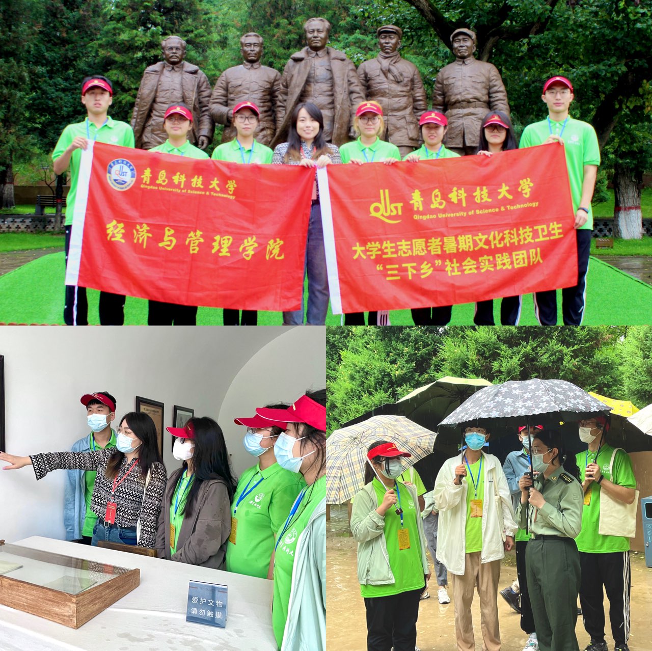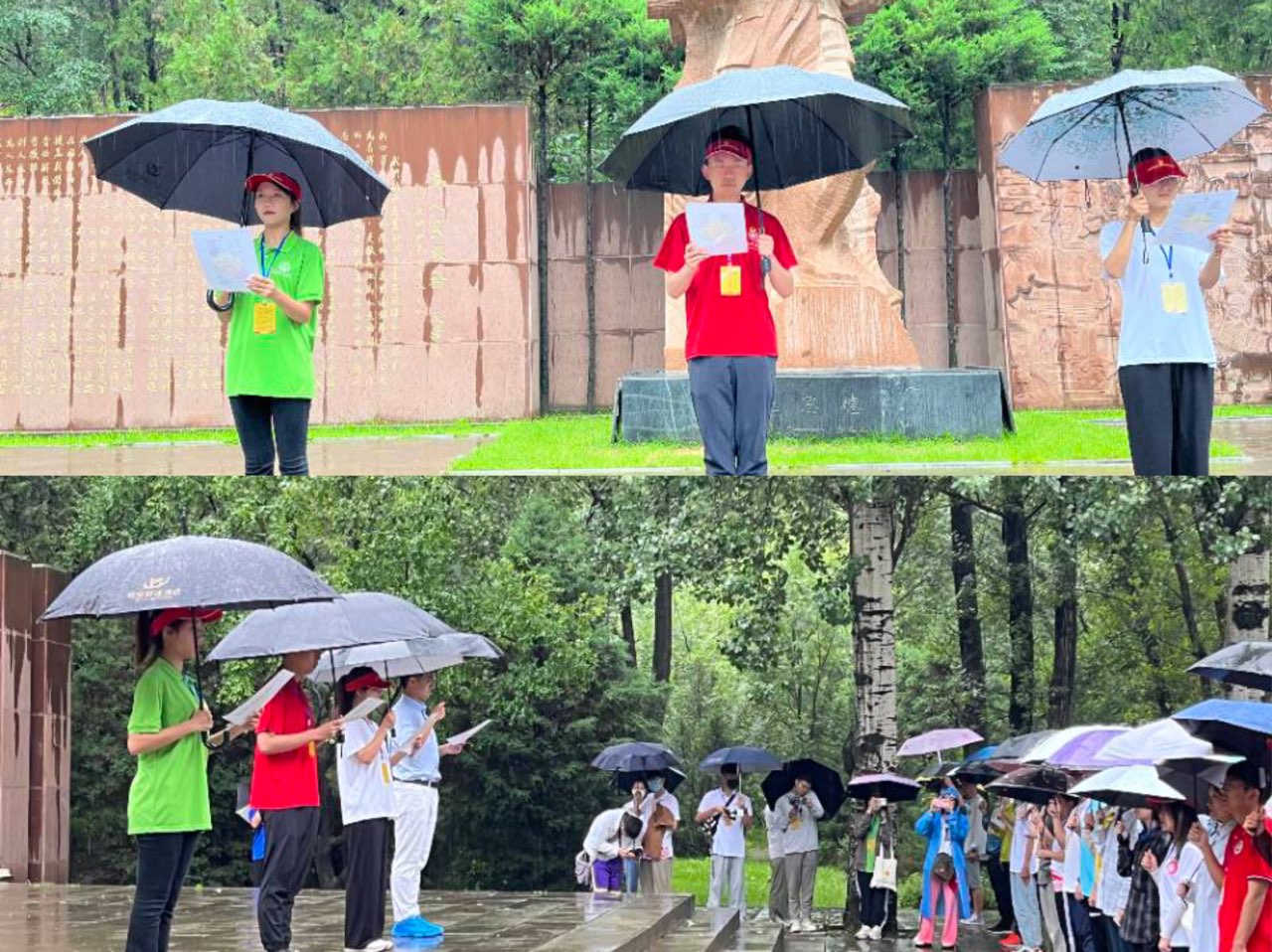 7月22日清晨,迎着濛濛的细雨,全体学员来到张思德纪念广场,薄雨中的延安,西山山麓的点点翠绿中,“为人民服务”几个大字格外醒目。步入张思德纪念广场,一尊张思德负薪前行的雕像映入眼帘。雕像两侧,立有两面石墙,一面镌刻着记录张思德生平事迹的浮雕;另一面,则刻有《为人民服务》全文。延安教育基地开展了《为人民服务》诵读活动,灰蒙的雨天因同学们宣誓“为人民服务”的坚定信念而闪烁夺目光芒,传达着红色力量,团队队员肖洋同学通过层层选拔,成功当选领诵,她感悟到:“今天队员们感悟为人民服务的红色精神,就要牢记党的性质和宗旨,擦亮青春底色,汲取前进力量,守初心、担使命,接续奋斗,驰而不息,练就过硬本领,锤炼品德修为,努力成为堪当民族复兴重任的开路先锋、事业闯将。”