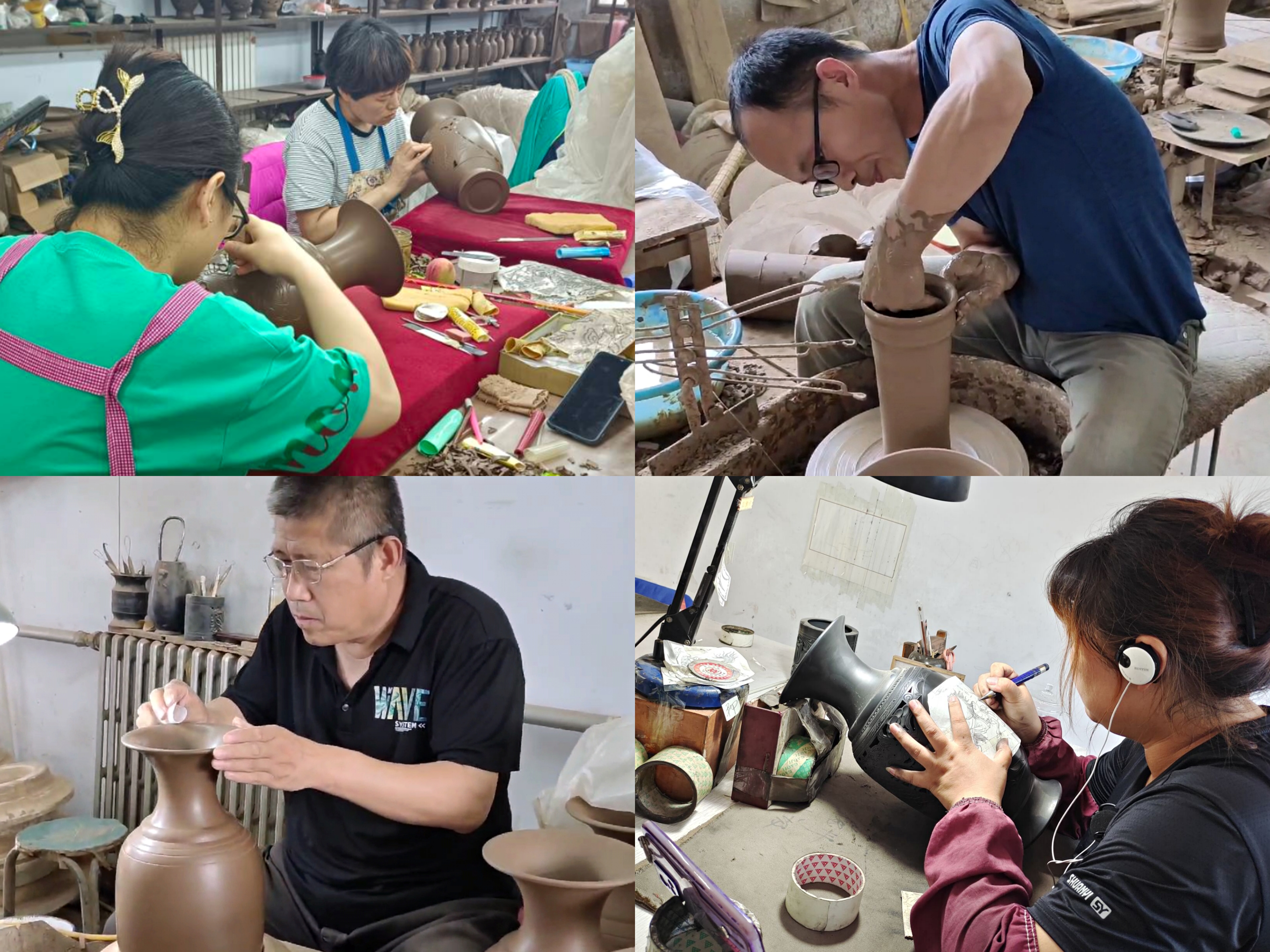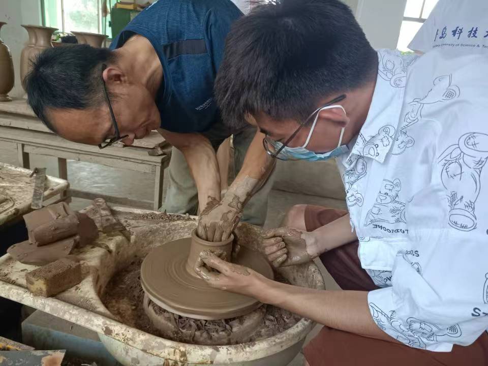 在孙连伟老师的指导下,团队成员体验了黑陶最初的拉胚成型过程。双手沾水润湿,轻抚着拉胚机上细腻、润滑的陶泥。脚踩踏板,体验手中陶泥旋转时的快感。通过孙老师的帮助,队员手中的泥坯逐渐成型,变幻多样,一时间心中的成就感油然而生。每个人都很认真去对待自己的作品,对待这项艺术。静下心来去做这样一件可以陶冶情操的事情,是我们在乏味的生活中的不多的乐趣。我们用心去感受制作的过程,去拿捏每一块胶泥,轻抚每一个图案。制作过程中队员们也深刻感受到黑陶制作过程的艰难,感悟到大师们的工匠精神,真正领略黑陶工艺的风姿与魅力。