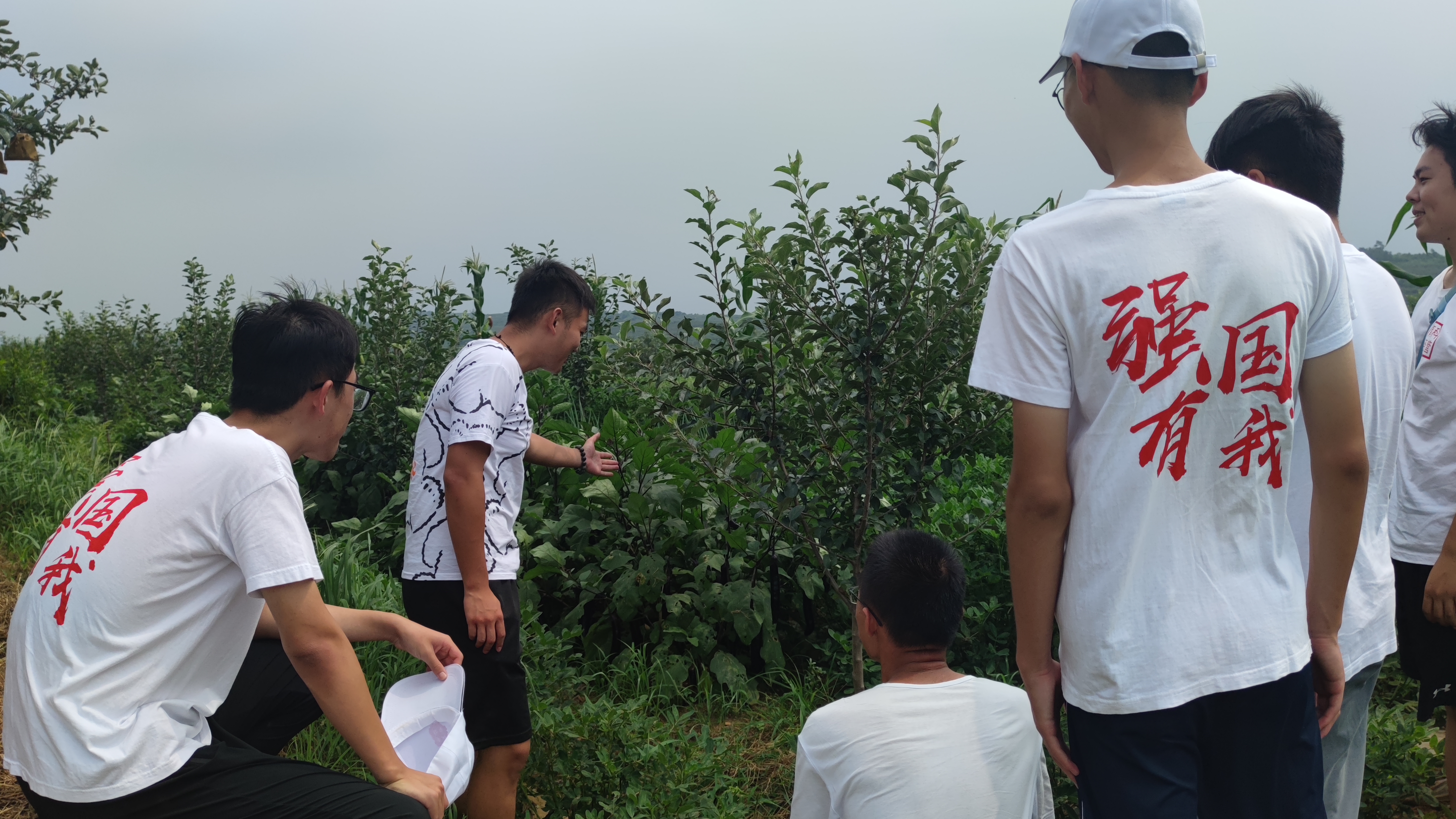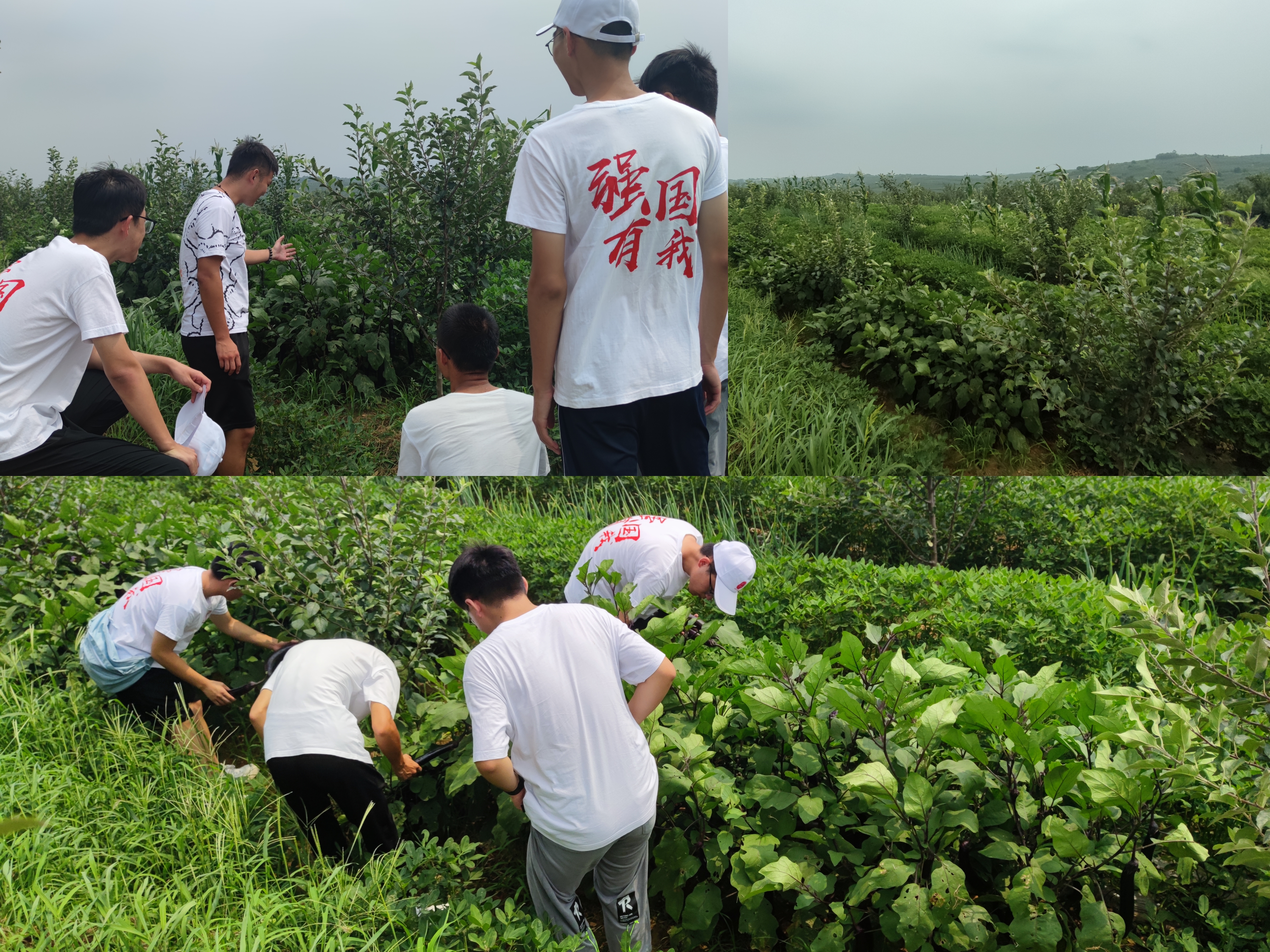 接下来,实践团队来到了苹果幼苗的种植基地,农民们在树之间的空隙种植茄子、玉米、花生等一年生农作物,其优点良多,一是合理经济利用了土地,二是有效利用了果园空间,三是改良了果园土壤结构,四是发挥了综合生态效应,同时成熟后的秸秆也会肥沃土壤。实践期间正值茄子成熟时期,适逢其会,队员们还一起帮农民采摘茄子,中午也品尝到美味的茄子,体会到了劳动的美妙。