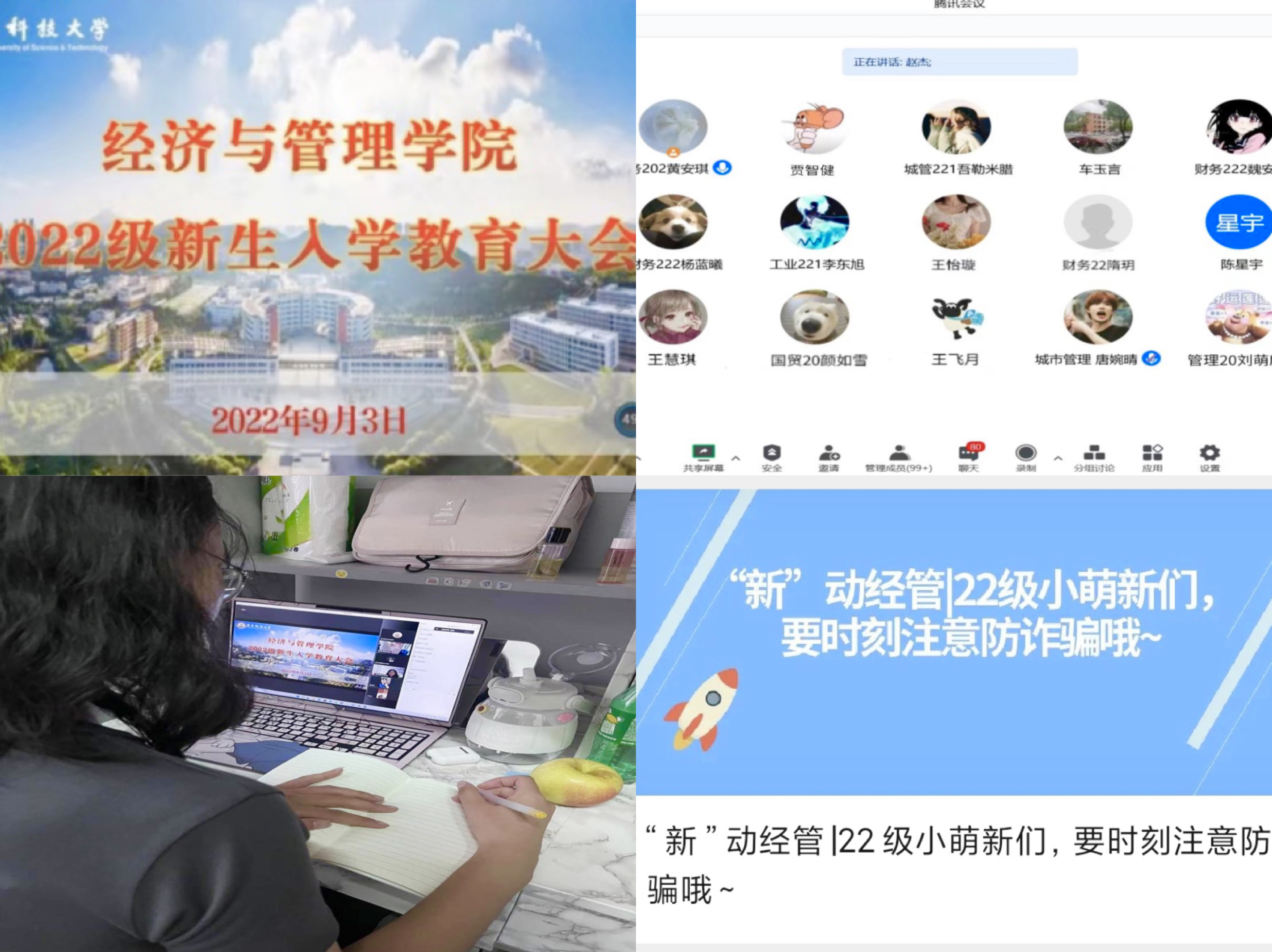 园生活、心理安全及防诈骗知识科普等内容,帮助新生提前融入大学环境新氛围;辅导员撰写“致全体2022级经管学子的一封信”,为新生送上开学前的第一份祝福;在官方抖音号进行迎新现场直播,方便新生家长实时关注新生入校报到的流程动态,走好家校合育第一步;根据疫情防控要求,新生入学后第一时间召开“青春向党,奋斗强国”线上教育大会,帮助新生强化专业认知与未来规划意识,开展爱校荣校教育,厚植新生爱国主义情怀,上好新生第一堂“思政课”。