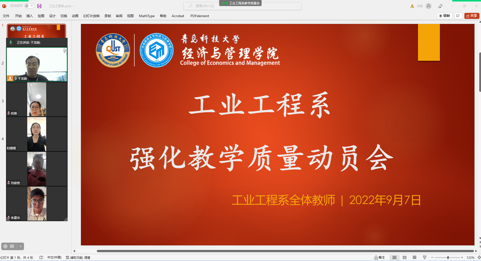 在应对疫情反复的严峻形势下,为切实做好2022级新学期工作,尽快适应特殊时期纷繁的教学科研节奏,9月7日,工业工程系全体教师线上举办强化教学质量动员会,党委领导班子联系支部领导出席会议,大会由系主任于龙振主持。