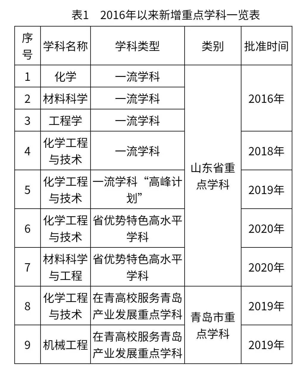 入选山东省“强特色”类高水平大学;2019年化学工程与技术、机械工程入选在青高校服务青岛产业发展重点学科(表1)。目前北京赛车PK10