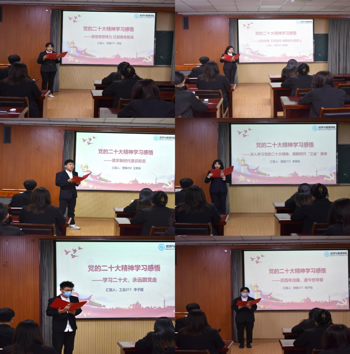 随后,各部门学生代表深刻围绕党的二十大报告,从大会主题、主要成果、目标任务、战略部署等方面进一步解读党的二十大精神。学生代表黄安琪同学表示,作为新时代青年,我们应时刻坚定永远跟党走的理想信念,用青春的智慧和力量奋力谱写中国式现代化新篇章,让青春在建设社会主义现代化国家的火热实践中绽放绚丽之花。之后,与会同学互相交流学习,对党的二十大精神进行了系统全面的学习。