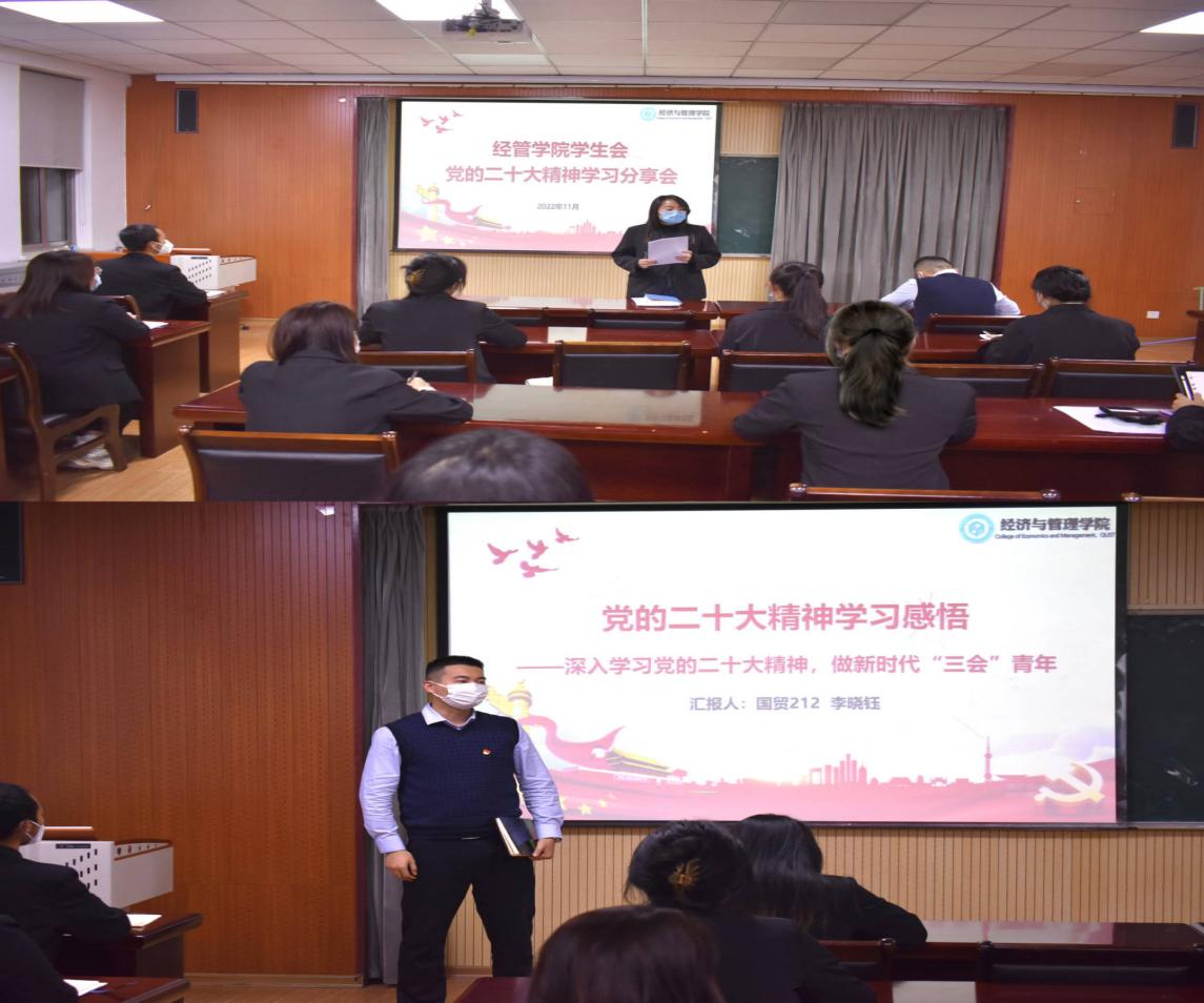 学生会于经管楼419召开了党的二十大精神学习分享会,学生会指导老师付凯、袁绍正出席会议,全体学生会骨干参与会议。