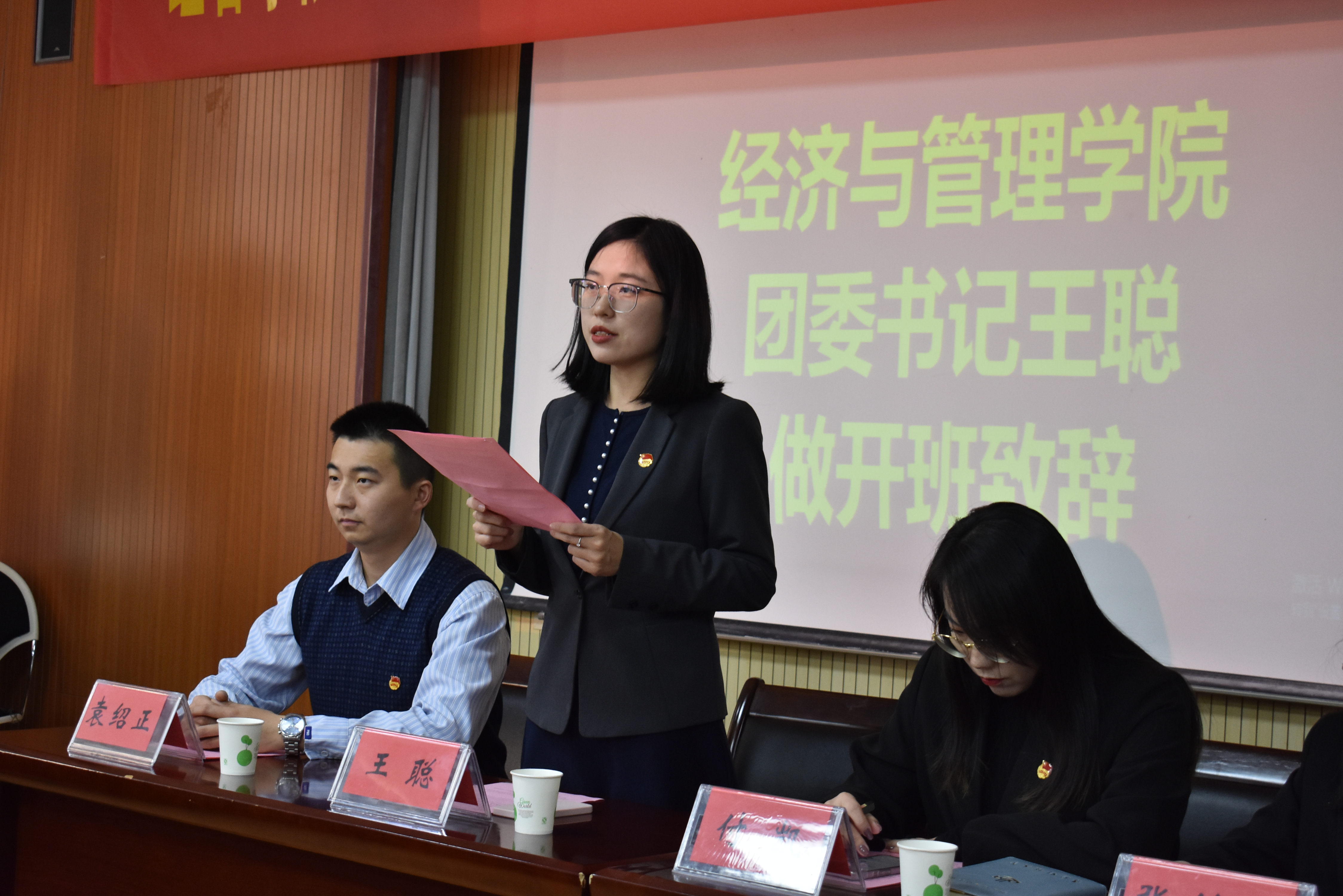 在经管楼419会议室举行2022-2023学年“青年马克思主义者培养工程”培训班开班仪式,团委老师及全体团学骨干与学员代表于线上线下同步参会。