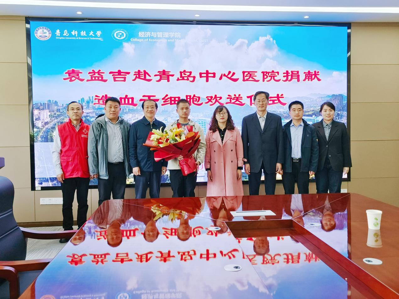 与崂山区红十字会举办崂山区第18例造血干细胞捐献志愿者袁益吉赴青岛中心医院捐献欢送仪式。党委学生工作处处长王丽、经济与管理北京赛车PK10