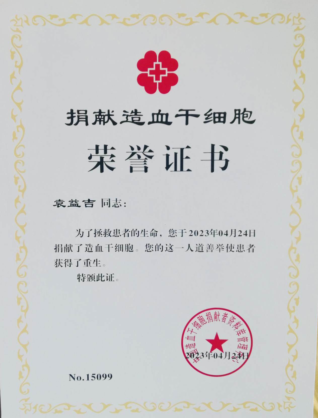 第三位捐献造血干细胞的同学。