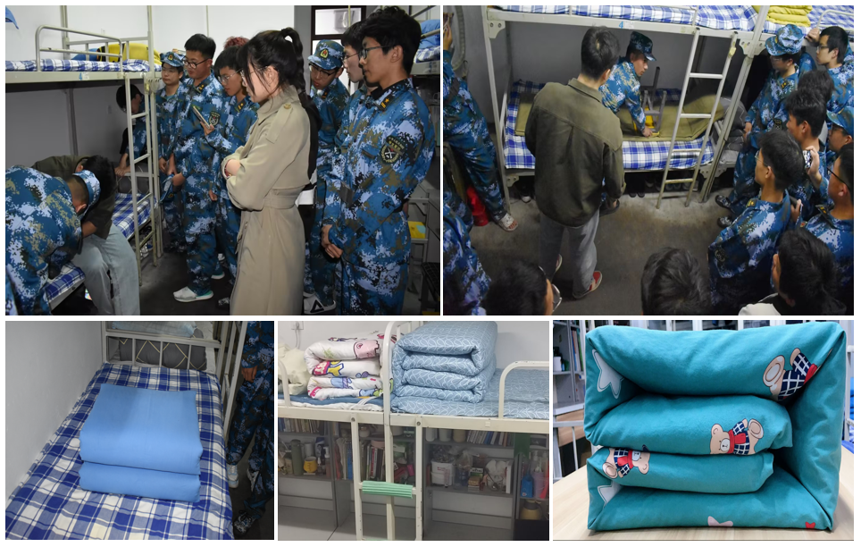 退役军人士兵对叠军被手把手进行“现场教学”,同学们按照步骤拍照记录过程,并用自己的被子动手实践。以连队为单位,开展宿舍内务评比活动,既培养同学们良好的生活习惯,营造整洁舒适的宿舍生活环境,也让同学们感受到了部队生活的严谨与整齐划一。