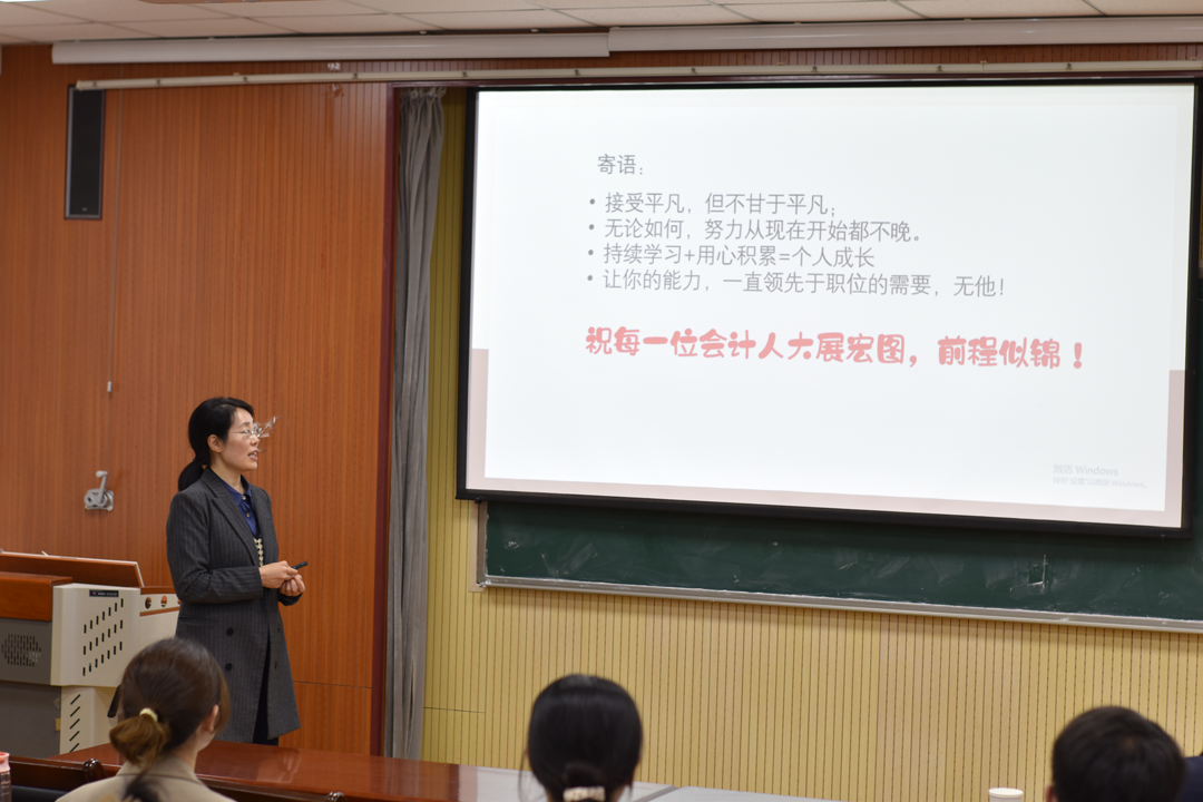 随后于老师对本次报告会做了总结,指出“成功=目标×行动×方法”。就职业发展而言,目标就是要通过职业规划确定职业目标,要确定好自己研究生期间的规划。在行动方面,要努力提高职业素养和职业技能,在研究生就读期间就要锻炼自己守时、认真、积极主动、高质量完成任务的职业素养,要培养自己的财务系统使用、办公软件应用、专业分析能力、沟通技能等多方面的能力,要通过向他人学习、思考总结等方式掌握行动的方法。