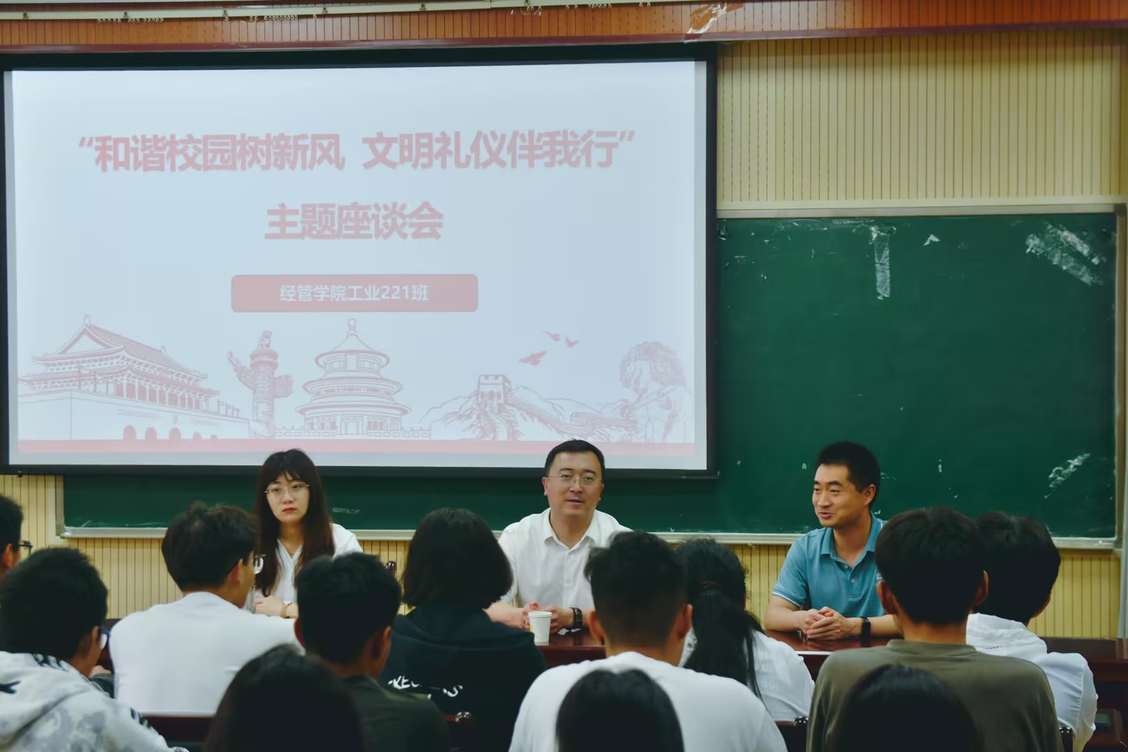 工业221在经管楼419会议室组织开展“和谐校园树新风 文明礼仪伴我行”主题座谈会。联系干部党委(校长)办公室副主任匡荣富来到同学们身边,倾听大家对文明礼仪的思考理解,与同学们畅谈学习生活中的问题困惑和所思所悟。北京赛车PK10