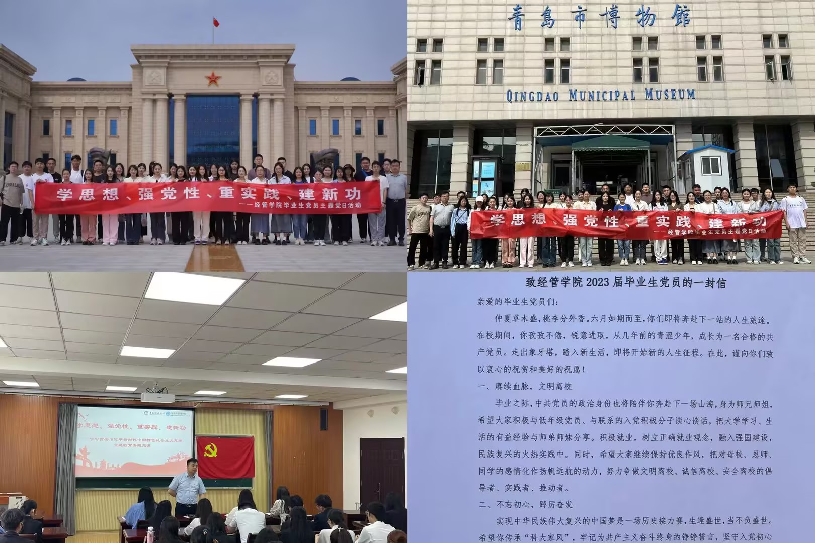 全体毕业生党员前往中国人民解放军海军博物馆、青岛市博物馆开展主题党日活动。在中国人民解放军海军博物馆,全体毕业生党员跟随讲解员先后参观室内展区、海上舰艇展区、陆上装备展区三大展区,通过实物参观、文献展览和音视频展示,近距离聆听海军故事,追寻人民海军的成长足迹,回顾人民海军的光辉历程,用心感悟海军战士们劈波斩浪、纵横海疆的博大情怀,逐梦深蓝、向海图强的爱国精神。随后,全体毕业生党员面对党旗重温入党誓词,回望初心使命,坚定理想信念。