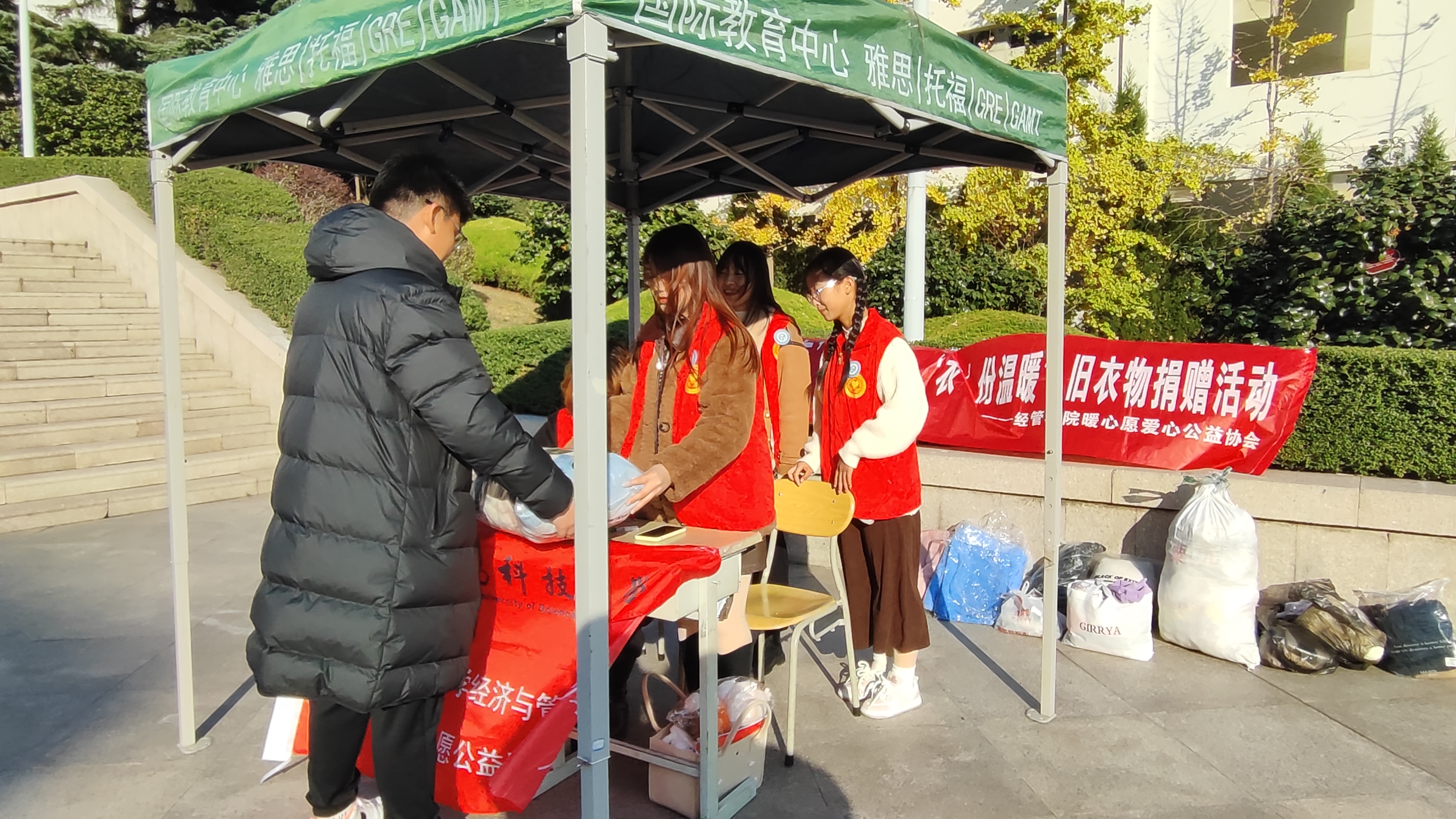 同学踊跃参与、积极捐赠,志愿者们将衣服进行分类、整理,并整齐排列,有序放置,弘毅广场洋溢着爱的气息,每一件衣服的捐赠,都增加了一点同学们对山区孩子们的关心与关爱。