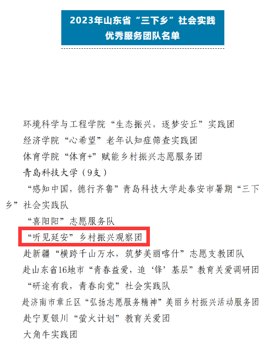 据悉,2023年暑期,团省委联合省委宣传部、省文明办、省教育厅等单位以“学习二十大 永远跟党走 奋进新征程”为主题,广泛组织动员全省大中专院校青年学生参加“调研山东”——暑期“三下乡”社会实践活动,深入学习宣传贯彻习近平新时代中国特色社会主义思想,引导和帮助青年学生在与现实相结合的“大思政课”中受教育、长才干、作贡献,以满怀的青春朝气和锐气,投身新时代社会主义现代化强省建设。为深入总结交流经验、激励广泛参与、发挥育人实效,选拔出一批在2023年暑期“三下乡”社会实践活动中表现突出的优秀集体、个人和项目。经基层申报、审核推荐、组织评议等环节,最终确定80个优秀组织单位、1130名优秀指导教师、2180名优秀学生、520个优秀服务团队、100个优秀服务基层实践项目。
