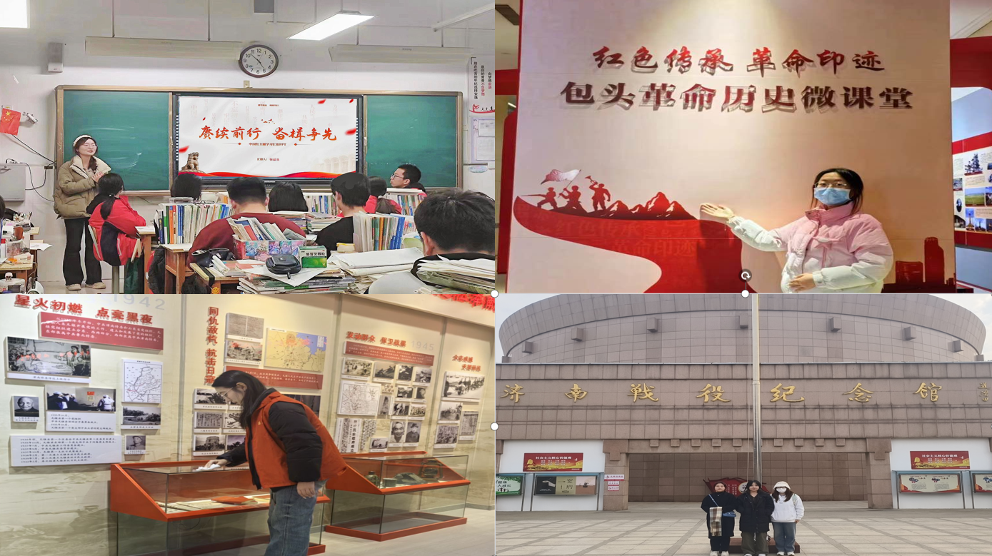 2023级物流管理专业学生薛正婕、工商管理专业“红雨”社会实践团队、工商管理专业辛枫翊等人为传承红色基因,探访内蒙古自治区昆都仑区包头市博物馆、济南英雄山、解放阁、一战华工纪念馆等地,重温红色记忆,赓续红色基因,并将习近平总书记关于革命精神的经典论述融入宣讲,弘扬红色精神,在追溯红色革命历史中汲取前进力量。工商管理专业学生张曼玉回到家乡母校,用理论讲解、随机提问、互动交流等方式,并通过丰富的图文资料与视频动画,带领学弟学妹们深入学习、领悟红色精神文化内涵,在学生心中种下一棵红色的种子,用红色基因润泽家乡土地。