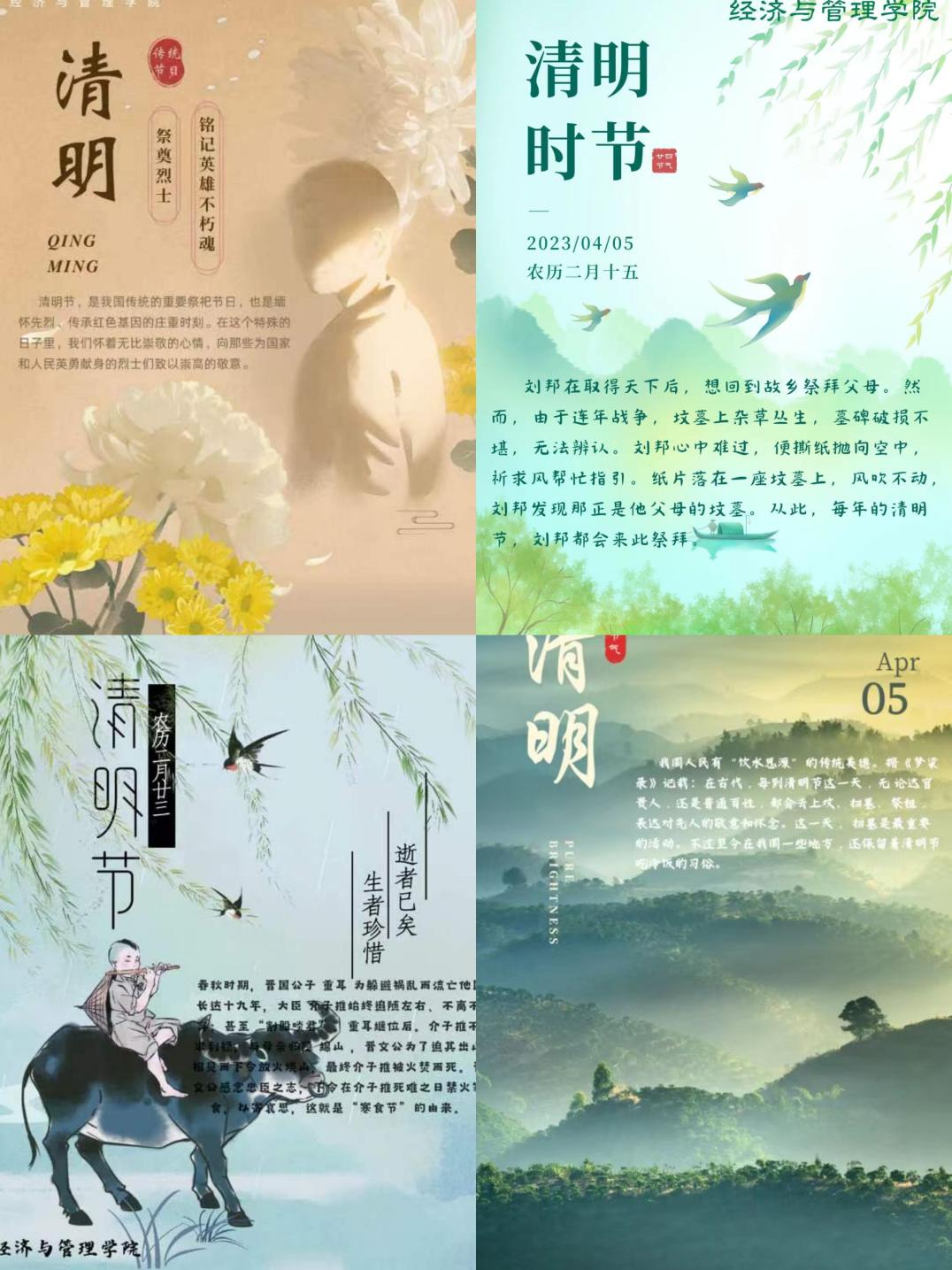 年年祭扫英雄墓,处处犹有长春风。清明节是祭奠逝者、缅怀先人的传统节日,同学们通过海报设计,讲述清明节的由来和典故,一幅幅佳作将对传统文化习俗的传承和敬意用环保健康的方式予以表达。同学们在活动中弘传统文化,扬时代精神,展现当代青年文化自信的精神风貌,让中华优秀传统文化在校园落地生根,开花结果。