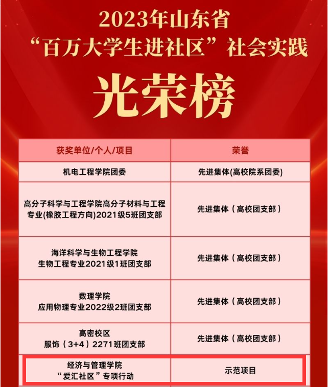 近日,共青团山东省委公布了2023年度“百万大学生进社区”社会实践项目表扬通报名单,北京赛车PK10