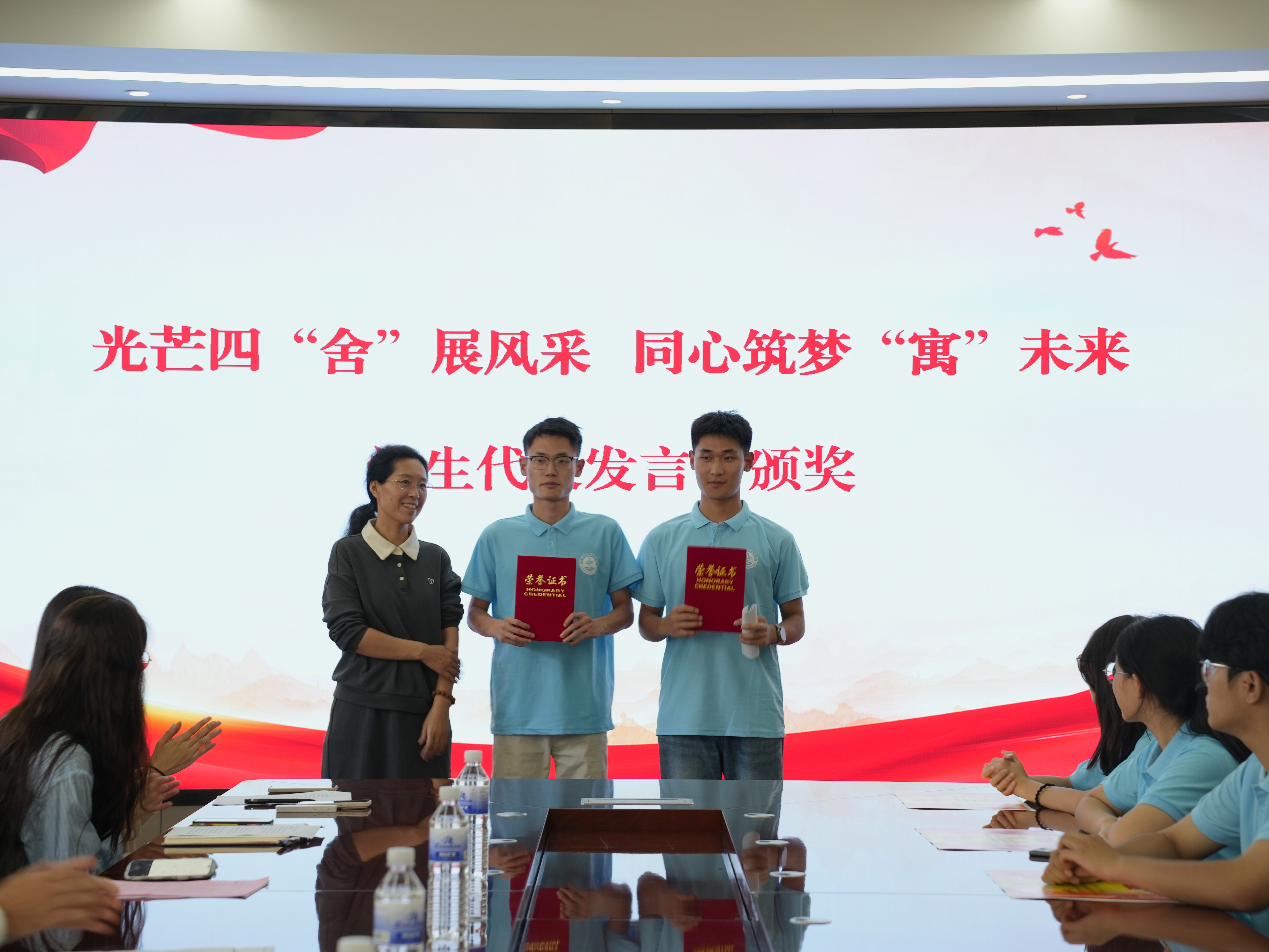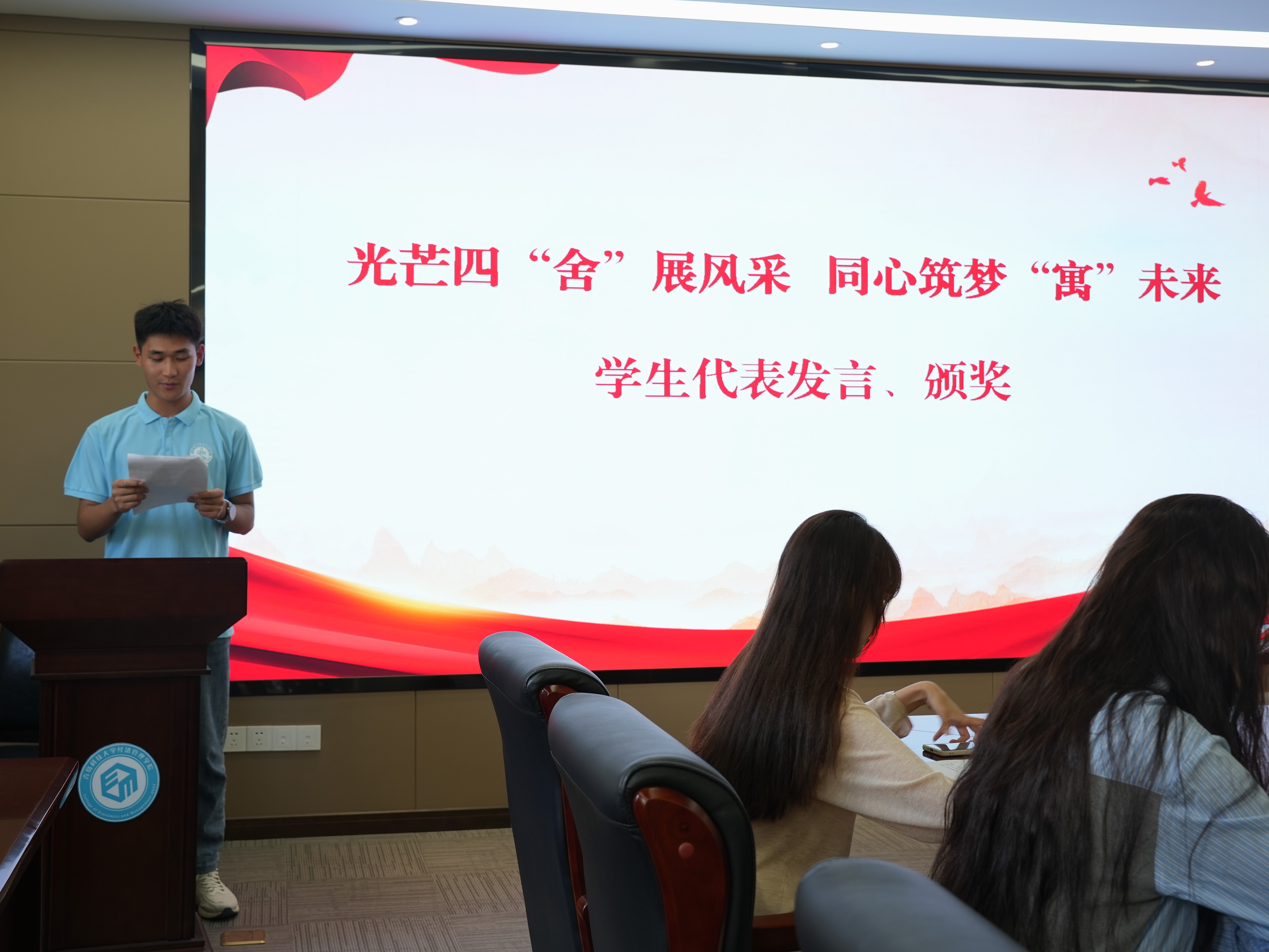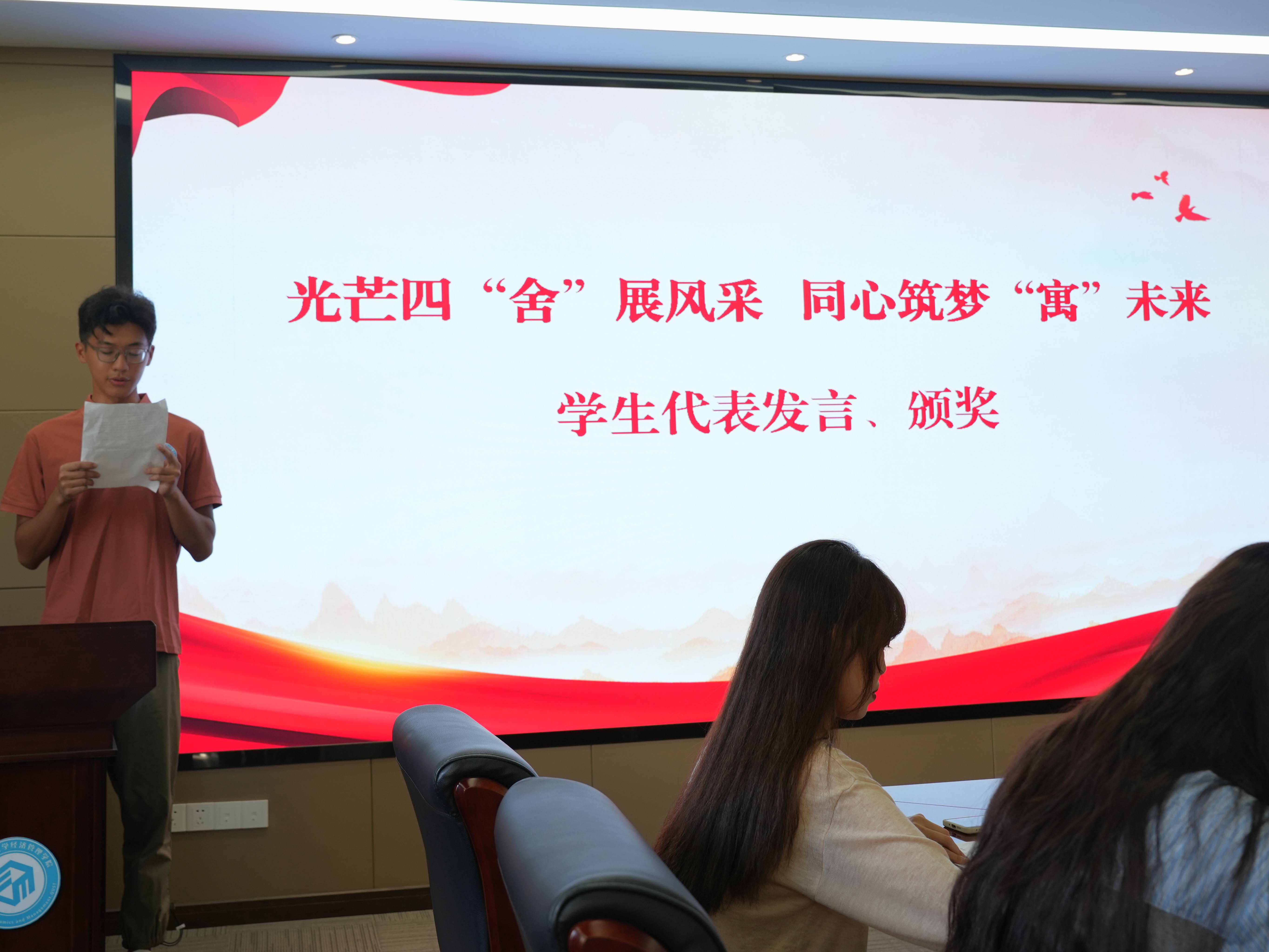 尤亭亭、齐青分别为标杆宿舍、优秀宿舍、优秀舍长颁发奖状,为在“共同体”计划中表现突出的同学颁发“先锋党员”证书,肯定了他们在宿舍帮扶中的贡献,希望他们继续发挥模范作用;并对新生提出殷切希望,勉励他们向优秀榜样学习,时刻保持规则意识,共建文明宿舍。