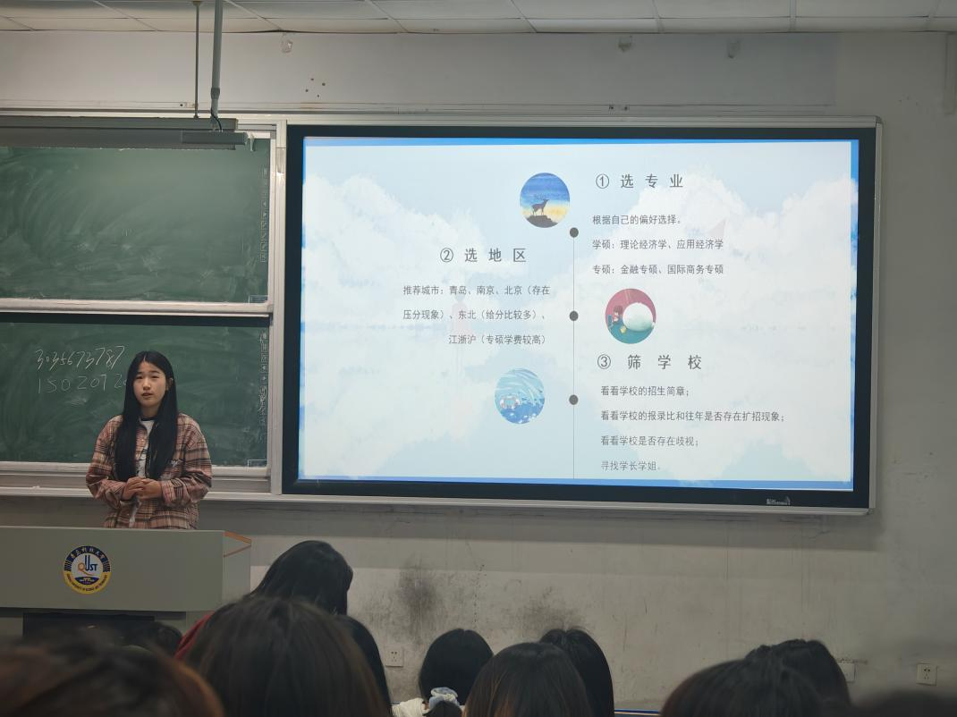 国际经济与贸易专业的杨婧围绕考研公共课的复习方法展开分享。她针对数学和政治两门科目,分享了自己的学习技巧和备考心得以及自己在备考过程中调整心态的方法,鼓励同学们保持积极乐观的心态,克服备考过程中的困难和压力。