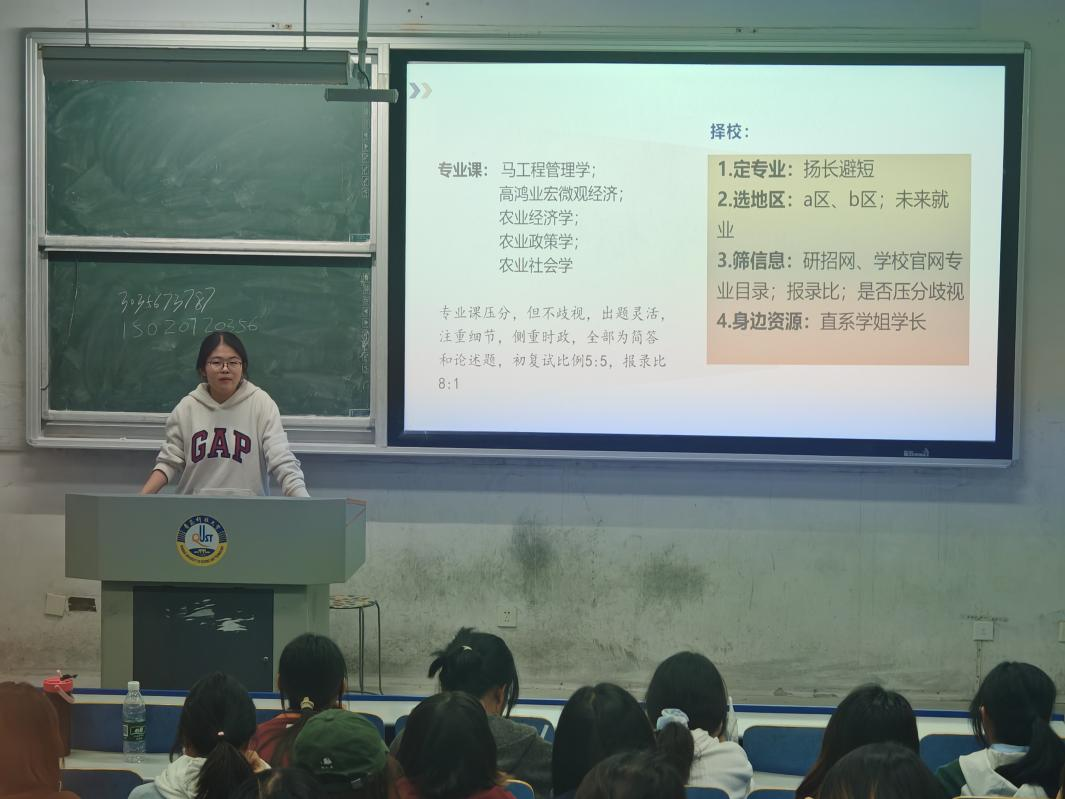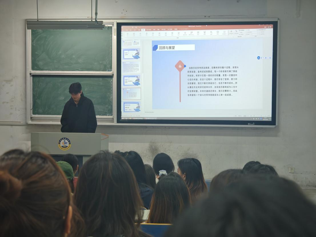 2025年4月28日,为深入贯彻落实立德树人根本任务,充分发挥优秀学子的示范引领作用,国际贸易与城市管理专业联合组织考研经验分享会于18:30在弘毅楼E区101圆满举行。李赞、刘心茹、汪一然、杨婧、张双圆五位优秀学子结合自身考研历程,为同学们带来了一场干货十足的考研经验分享盛宴。