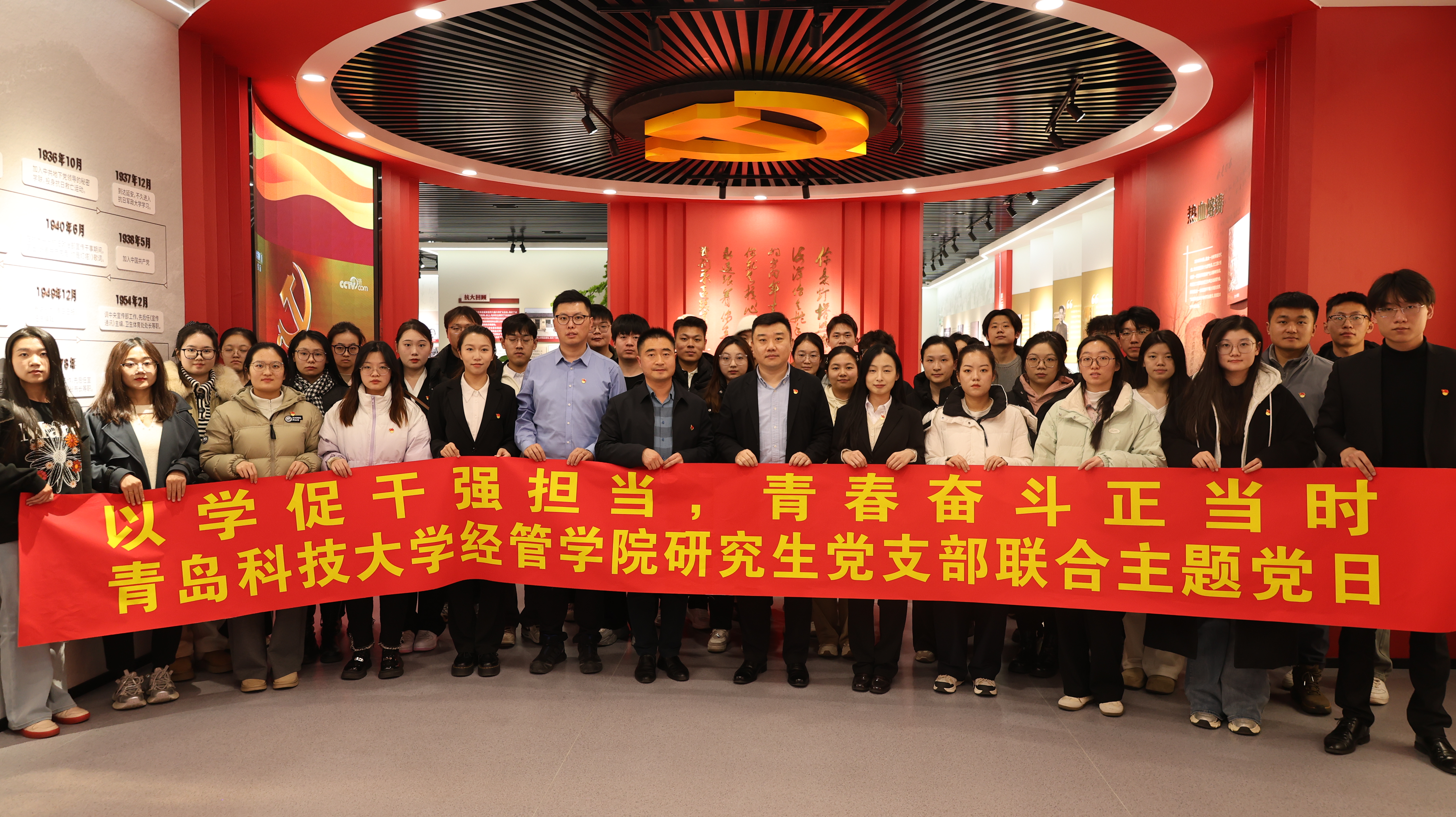 研究生第一、第二党支部赴青岛日报社“永恒的灯塔”党员教育阵地联合开展“以学促干强担当,青春奋斗正当时”主题党日活动。通过“观展研学+党课教学+红色诵读+初心重温”四位一体的党员教育体系,为党员们带来了全方位、沉浸式的学习体验。