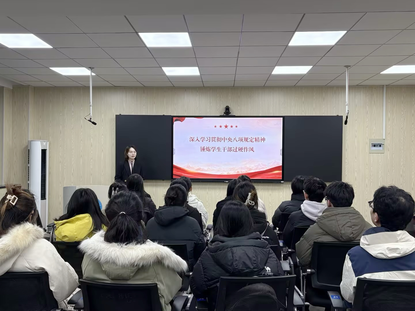 举办“深入学习贯彻中央八项规定精神 锤炼学生干部过硬作风”主题团课。