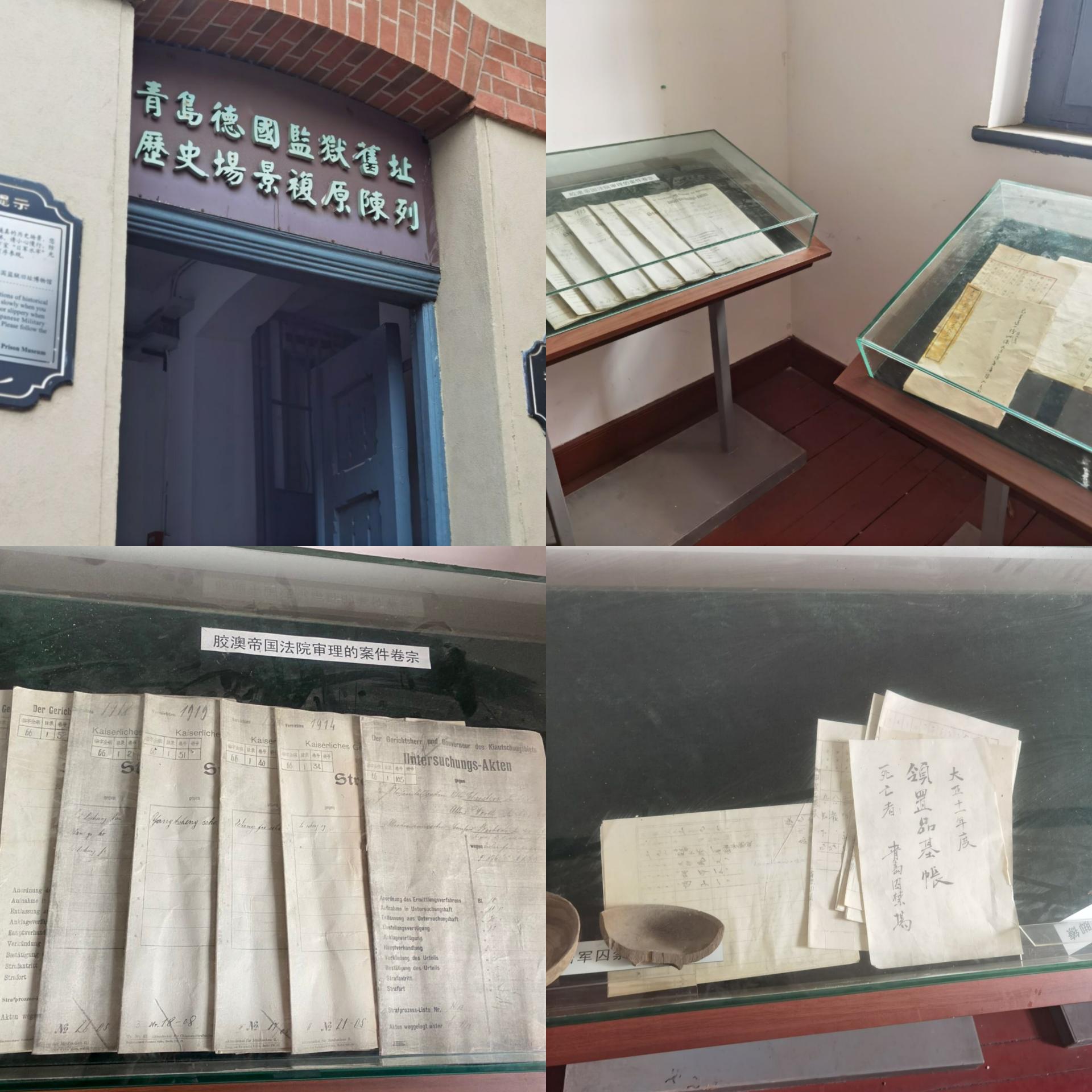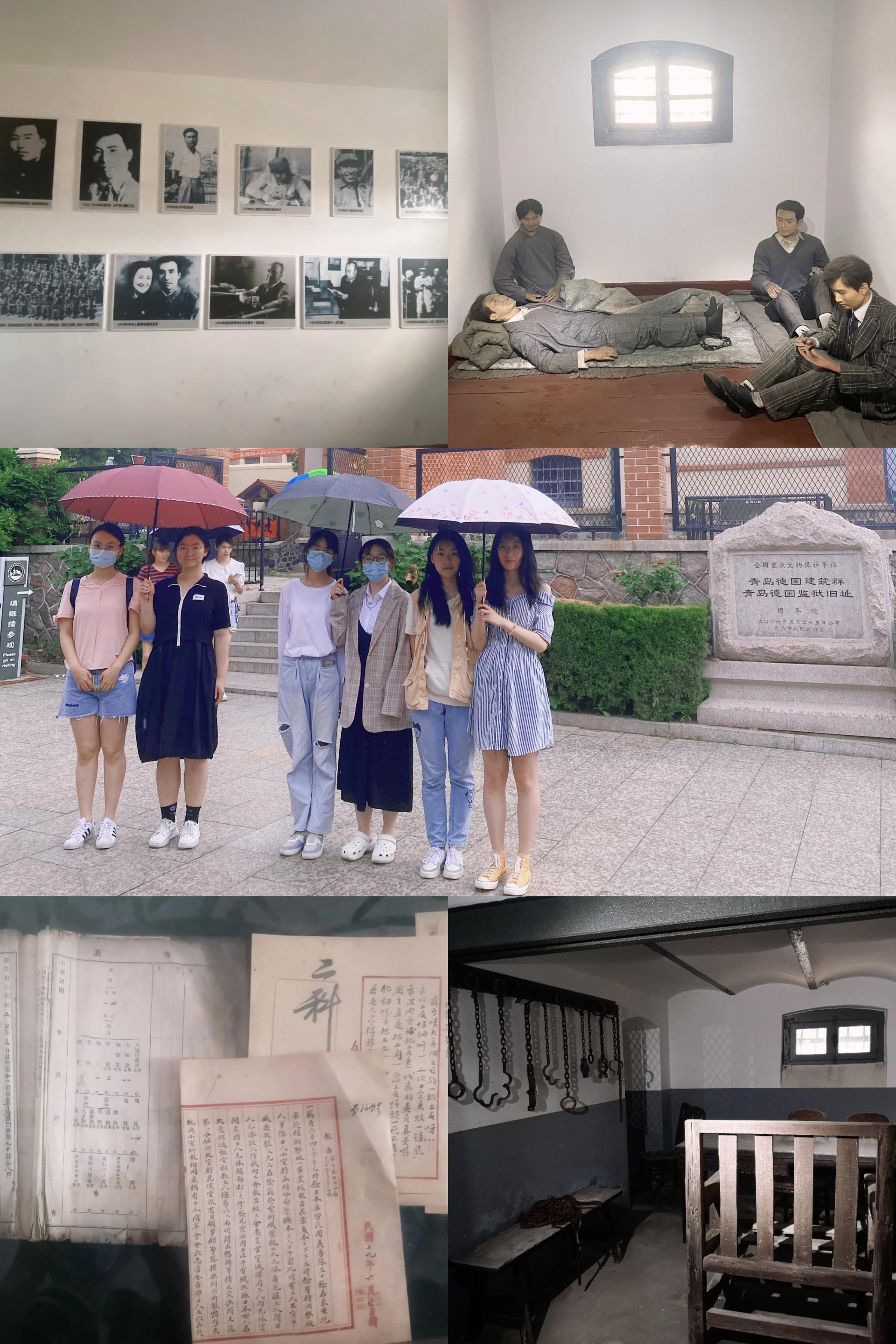 在进入博物馆后,团队怀着敬畏的心情参观了“仁”字号监房。每个牢房都十分精简,没有床,只有薄薄的一层草席,厚重的牢门和牢门上用来监视的小孔的都给人十分压抑的感觉。沿着石阶团队到了二楼,因为窗户很小,所以透出的光线很少,致使整条楼道上很昏暗。其中一间牢房关押着青岛工人运动领导人、中国青岛四方支部书记李慰农和《青岛公民报》主笔胡信之,他们1925年7月被捕入狱,后人通过建造他二人的硅胶塑像来纪念他们为国家作出的卓越贡献,尽管他们身处那样恶劣的环境,手上脚上都戴有重重的镣铐,但是他们眼神坚定,英勇地作出了牺牲,在其相邻的房间中承载着他二人的英勇事迹。团队还参观了日本青岛海军禁场水牢,由于水牢、刑讯室的位置都在地下室,光亮都只能靠灯光,等到团队出去以后,才发现一扇狭小的小窗通向了地下室。在这样压抑的环境下,团队不禁颤栗,看着审讯室陈列的刑具,联想到许多历史剧中囚犯受刑时惨烈的叫声,更敬佩那些为国家做出牺牲的先烈所经受的,他们的精神永远留在团队心中。