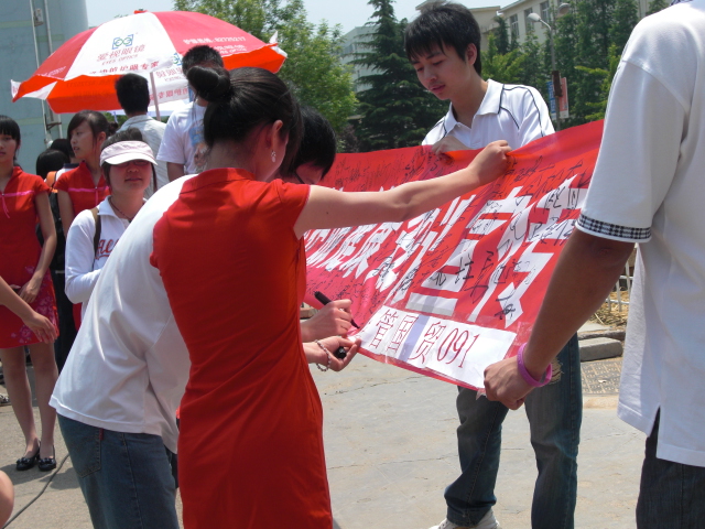 活动的举办受到四方校区广大同学的热烈欢迎,过往同学纷纷在写有“爱眼护眼,健康生活每一天”的横幅上签名,并写下了对母校建校六十周年的美好祝福。
