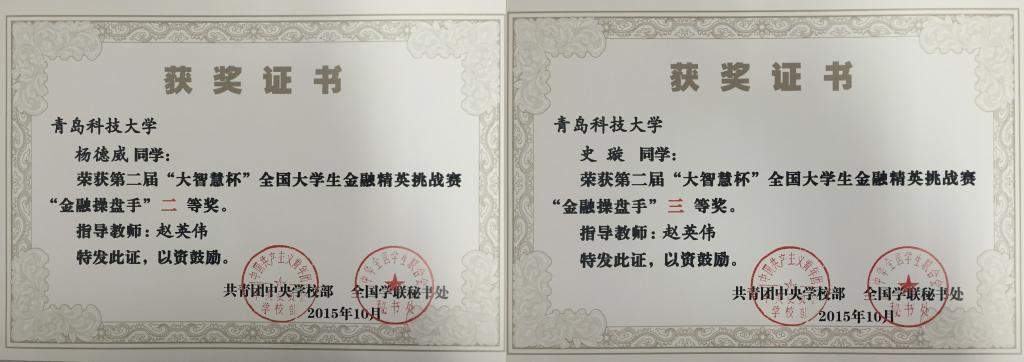 杨德威、吴国晓、朱小虎三位同学获挑战赛“金融操盘手”二等奖,陈敬、史璇等九位同学获三等奖。
