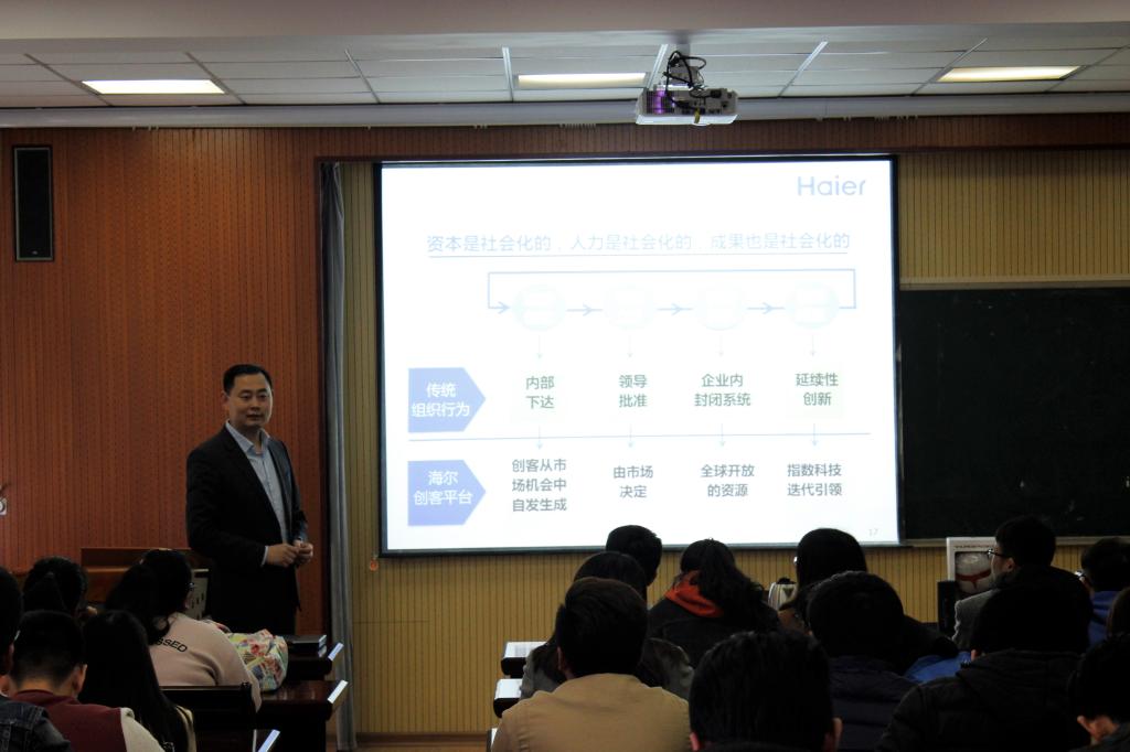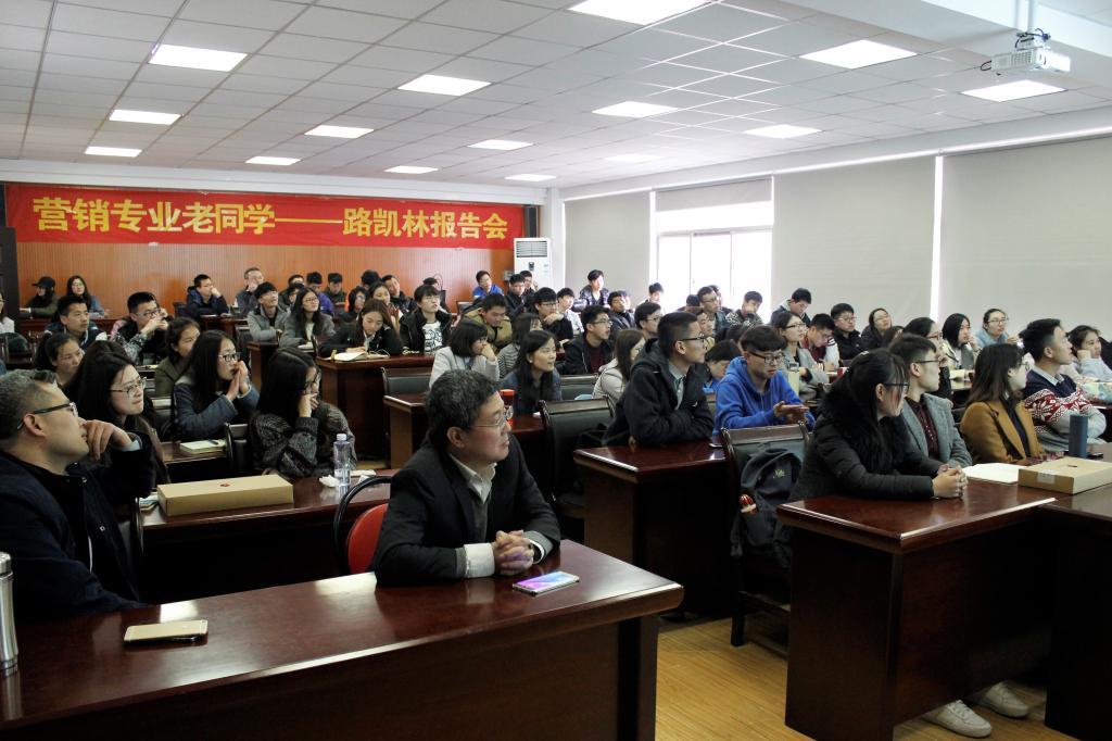 2004届营销专业优秀毕业生、现海尔集团雷神科技公司CEO路凯林带着对母校的浓烈情谊,回顾了大学时期的校园生活,介绍了目前的工作和学习情况。路凯林结合自身的实践经验和研究成果,讲解了海尔的管理理念、发展历程,从政策、经营、创新、市场等方面对企业发展历程进行了全面分析,并重点围绕大学生品质养成与个性发展提出了殷切期望。在提问互动环节,大家争相提出自己的疑问,路凯林结合自身经历一一耐心地为同学们解答。