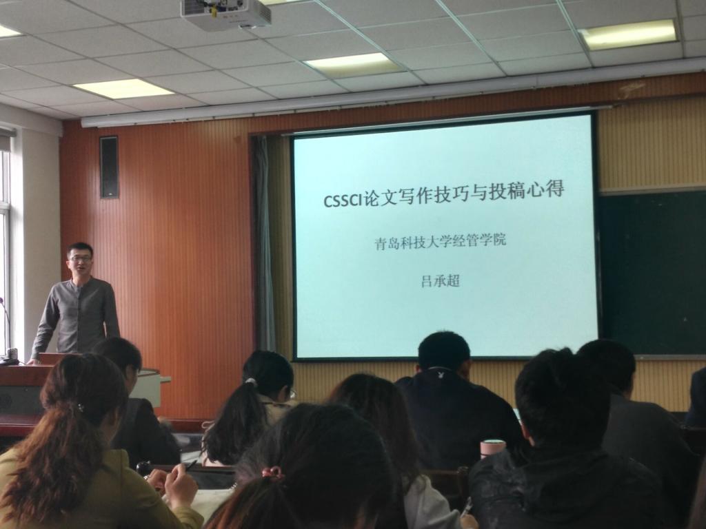 教师吕承超作了题为“CSSCI论文写作技巧与投稿心得”的报告。吕老师把本次报告内容演化为经济学理论,用“消费者理论”说明投稿时注意学科分类的重要性;用“厂商理论”介绍了好文章应满足的条件;用“均衡理论”展示了文章质量与供需之间的关系。他强调要写好文章应多看、多读、多思、多写,这样才能达到“不战而屈人之兵”的效果。