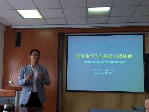 博士、副教授李长胜与同学们交流、分享科研路上的心得体会。首先,他就同学们应该如何度过研究生生活提出了建议,他希望同学们能够脚踏实地的做学问,提高研究能力,进而在以后的工作、学习中快速提升综合能力。随后,李长胜老师以自己在《Applied Energy》(SCI)上发表的文章为例,详细介绍了文章的写作方法、修改技巧及投稿过程中的心得体会。他希望同学们能够多阅读外文文献,在阅读中挖掘写作思路,开发写作潜力。最后,两名研究生代表分别汇报了学术论文《基于融资效率视角的区域经济差异分析》和《金地集团股利政策的影响因素研究》,在场师生就论文中的不足展开讨论并提出修改建议,同学们纷纷表示受益匪浅。