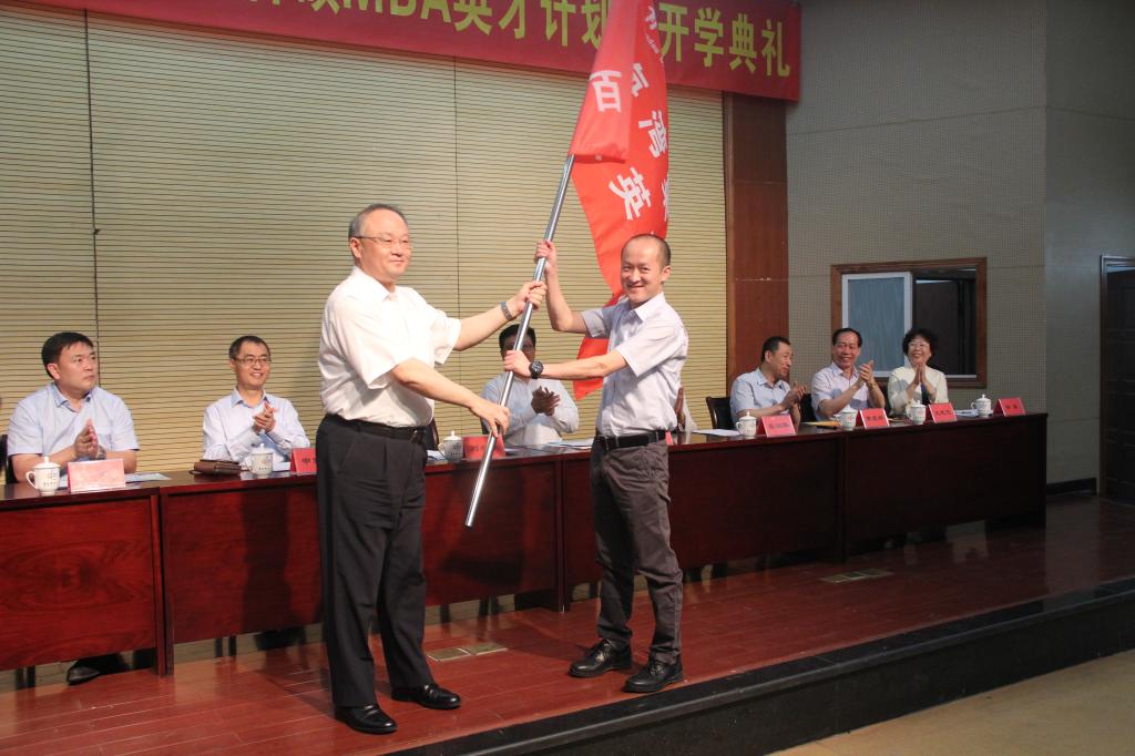 开学典礼上,刘兴云为“百硕MBA英才班”授予班旗。