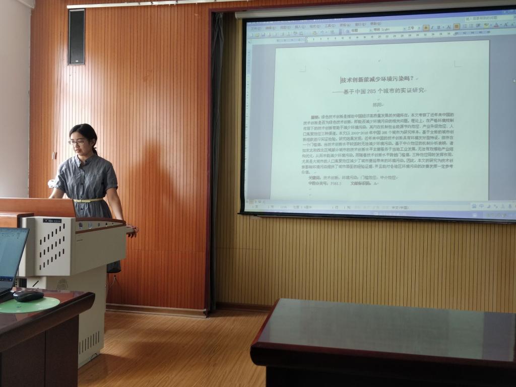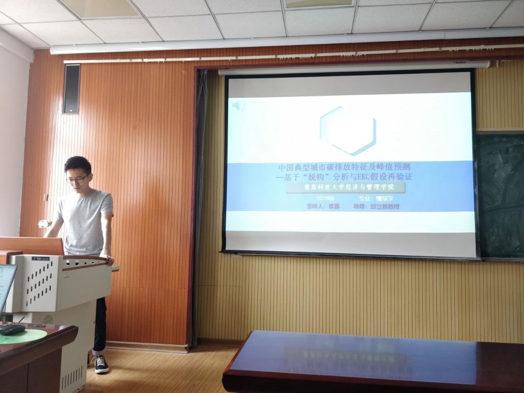 随后,2016级研究生袁赛向在座师生汇报了题为《中国典型城市碳排放特征及峰值预测-基于“脱钩”分析与EKC假设再验证》的报告,该报告通过脱钩分析法、工具变量法等方法进行研究,分析了产业结构、城镇化、人口数量等因素对碳排放的影响。教师代表王裕锦和陈明老师对袁赛同学的研究成果表示了肯定,并提出了几点建议。