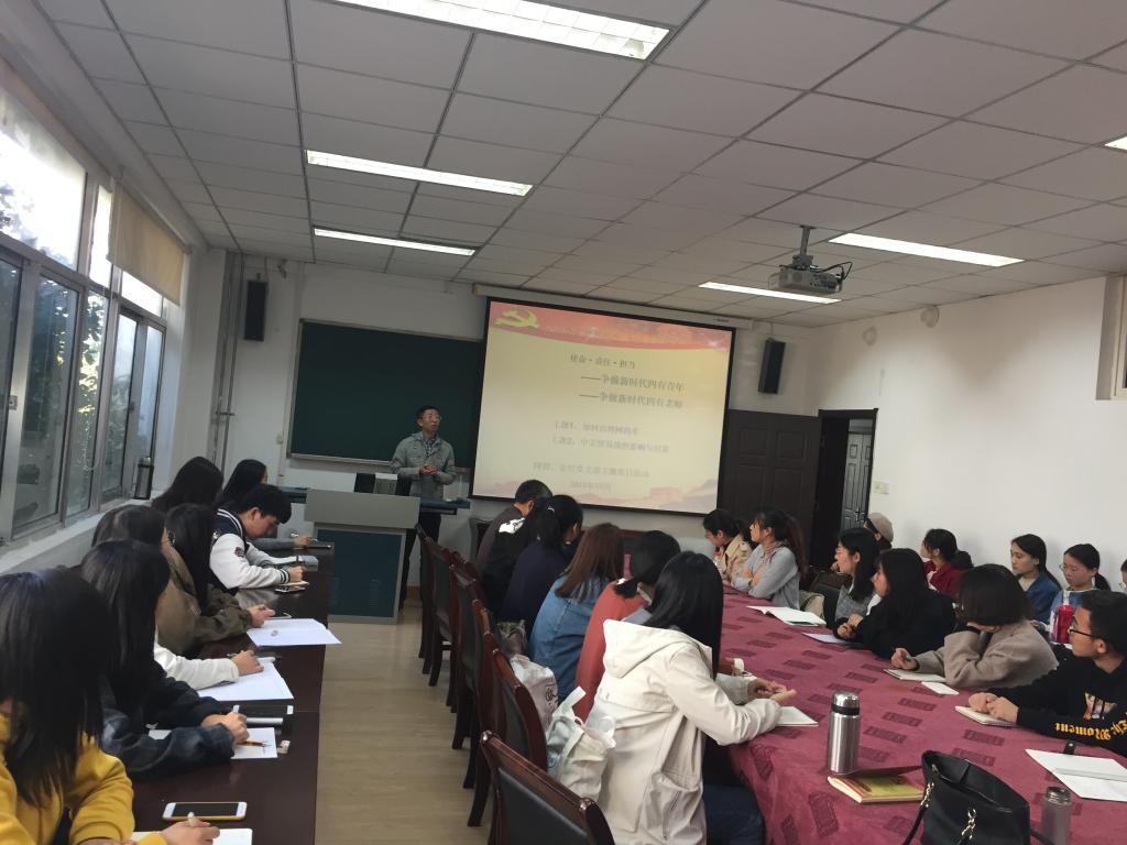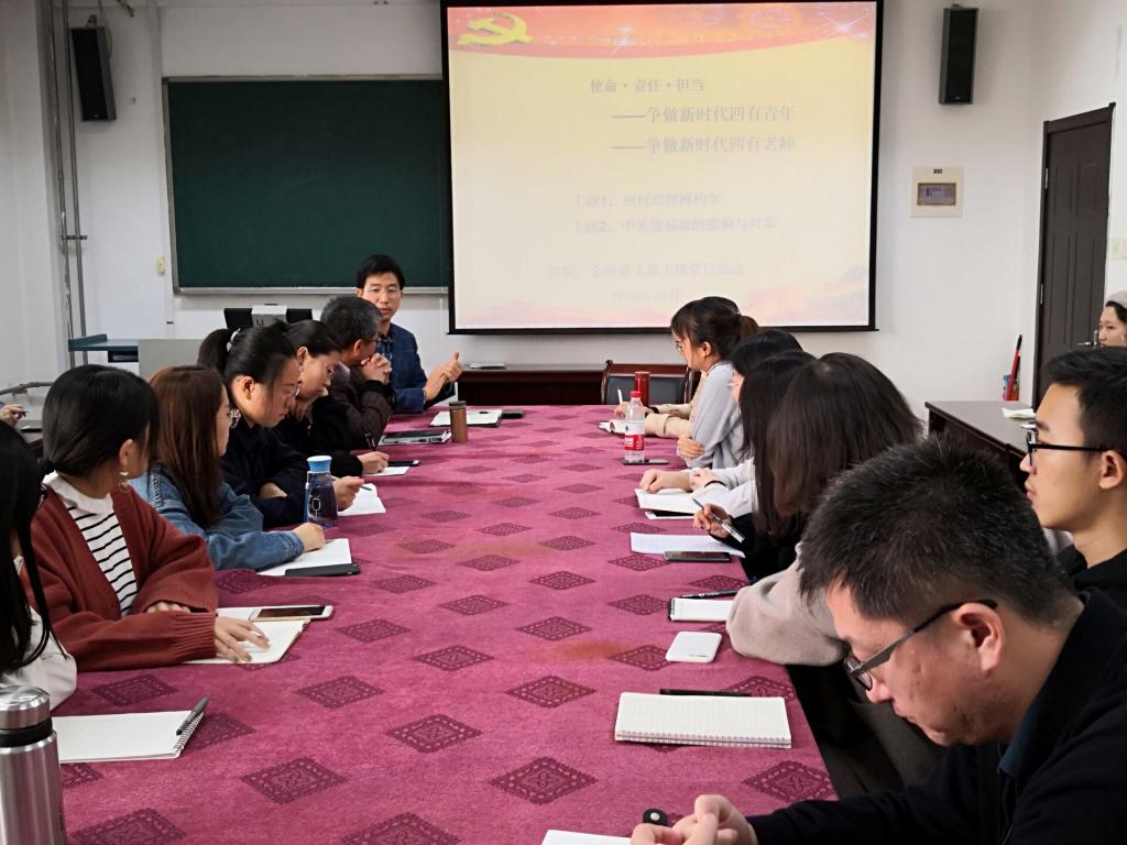 国贸、金经党支部全体师生党员和入党积极分子于415教室举办了以“使命、责任、担当——争做新时代四有青年、争做新时代四有教师”为主题的党日活动。此次党日活动结合国贸、金经两个党支部的教学特长,通过主题讨论和专题讲座的形式分别对两个热门话题进行了学术探讨。