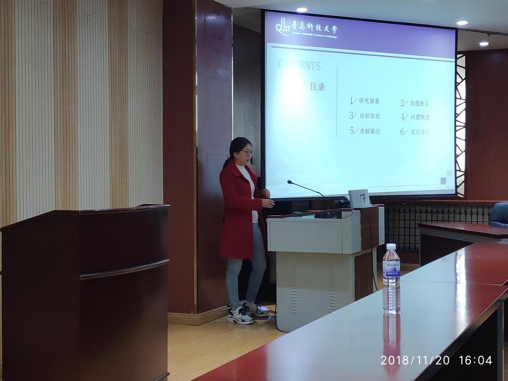 物流管理系王艳婷博士分享了其目前的一篇研究论文《随机动态环境下项目进度计划与控制》。王博士从研究背景、选题意义、目前现状、问题模型、求解算法和优化结论六个方面具体阐述了研究主题。王博士认为采用前摄-反映的调度方式制定项目计划非常有必要,一方面可以监控项目计划实施的情况,另一方面又可以提高基准进度抗风险的能力,提高资源运用效率。