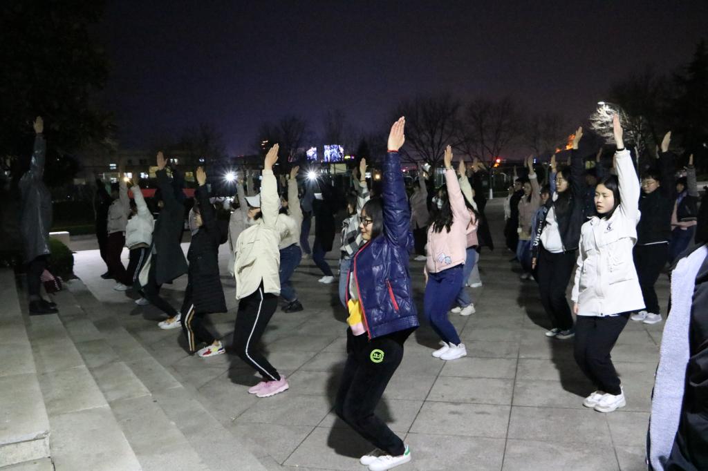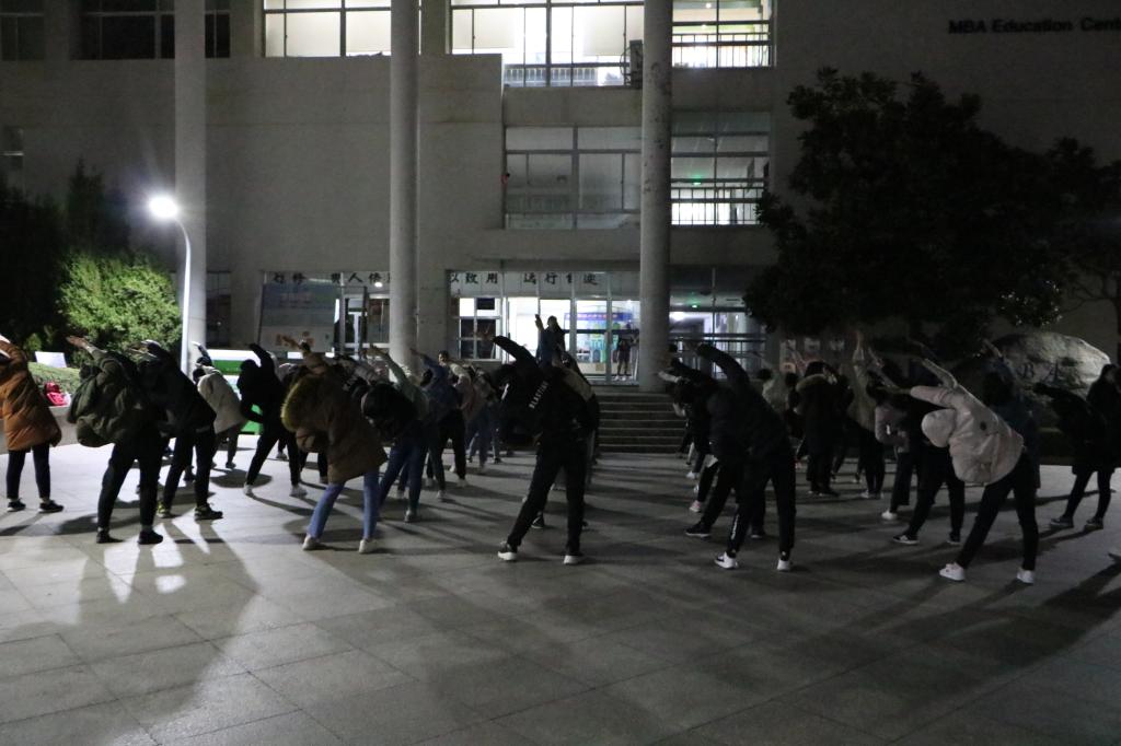 在前四次训练中,队员们学习了预备节,伸展运动、扩胸运动、踢腿运动等全部的内容,本次集训是复习强化之前所学动作,并对整齐度和动作力道进行规范。凛冽的寒风阻挡不了同学们热情似火的心,为了达到动作标准、整齐划一的视觉效果,参赛队员们刻苦练习,一点点纠正,一遍遍重复强化,用坚韧与默契践行着不怕苦不怕累的精神。