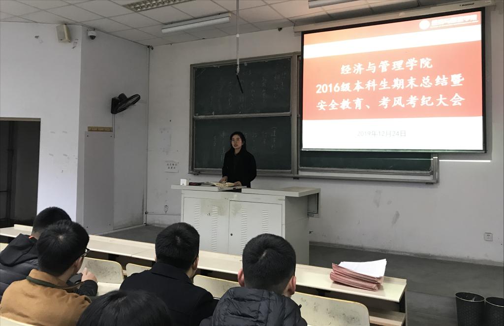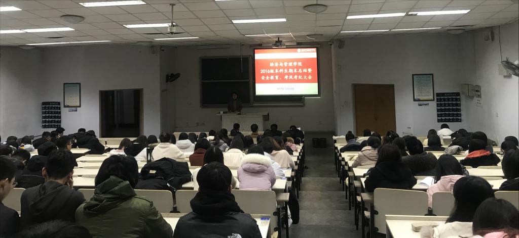 2016级本科生于弘毅楼E302室召开期末总结暨安全教育、考风考纪大会。本次大会由16级辅导员王聪、付凯主持,16级全体学生参加。
