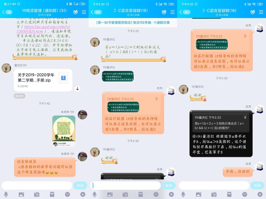 物流管理191、192团支部为帮助上学期期末考试中挂科和学习存疑较多的同学不耽误新学期的正常学习,成立了“C语言”QQ学习小组,通过资源分享、视频沟通等途径进行高效率、多趣味的线上答疑活动。学习小组中的“老师”认真履行自己的职责,耐心对自己的“学生”讲解学科的难点重点以及复习的技巧。小组成员们在学习过程中共同获益,共同进步,真正体会到“教学相长”的乐趣。