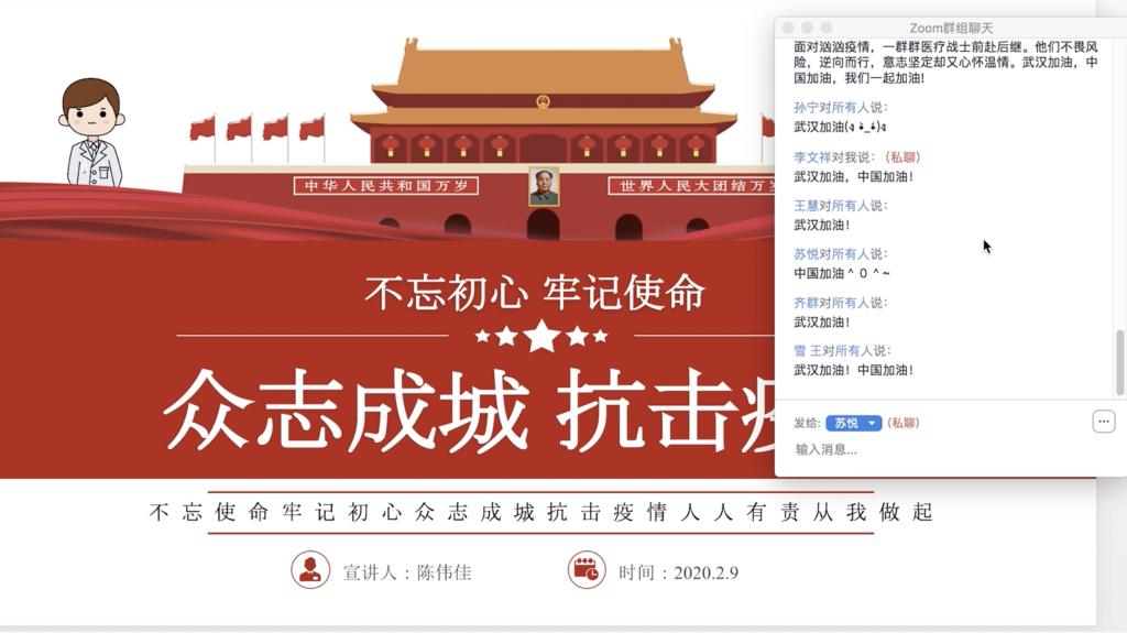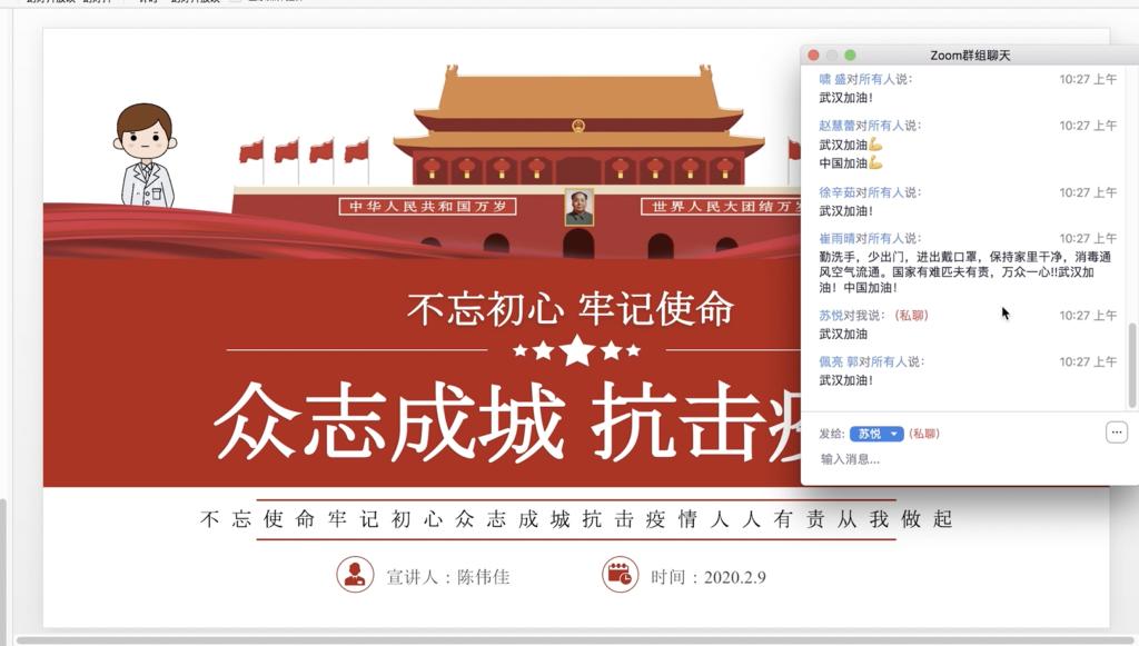 在班委和各位寝室长的配合组织下,团支书陈伟佳利用zoom会议平台开展了疫情防控知识普及学习,主要以PPT为主,从(一)总书记就抗击疫情给出“最强攻略” (二)什么是新型肺炎(三)疫情防控工作(四)守初心担使命,打赢疫情防控阻击战四个方面展开。